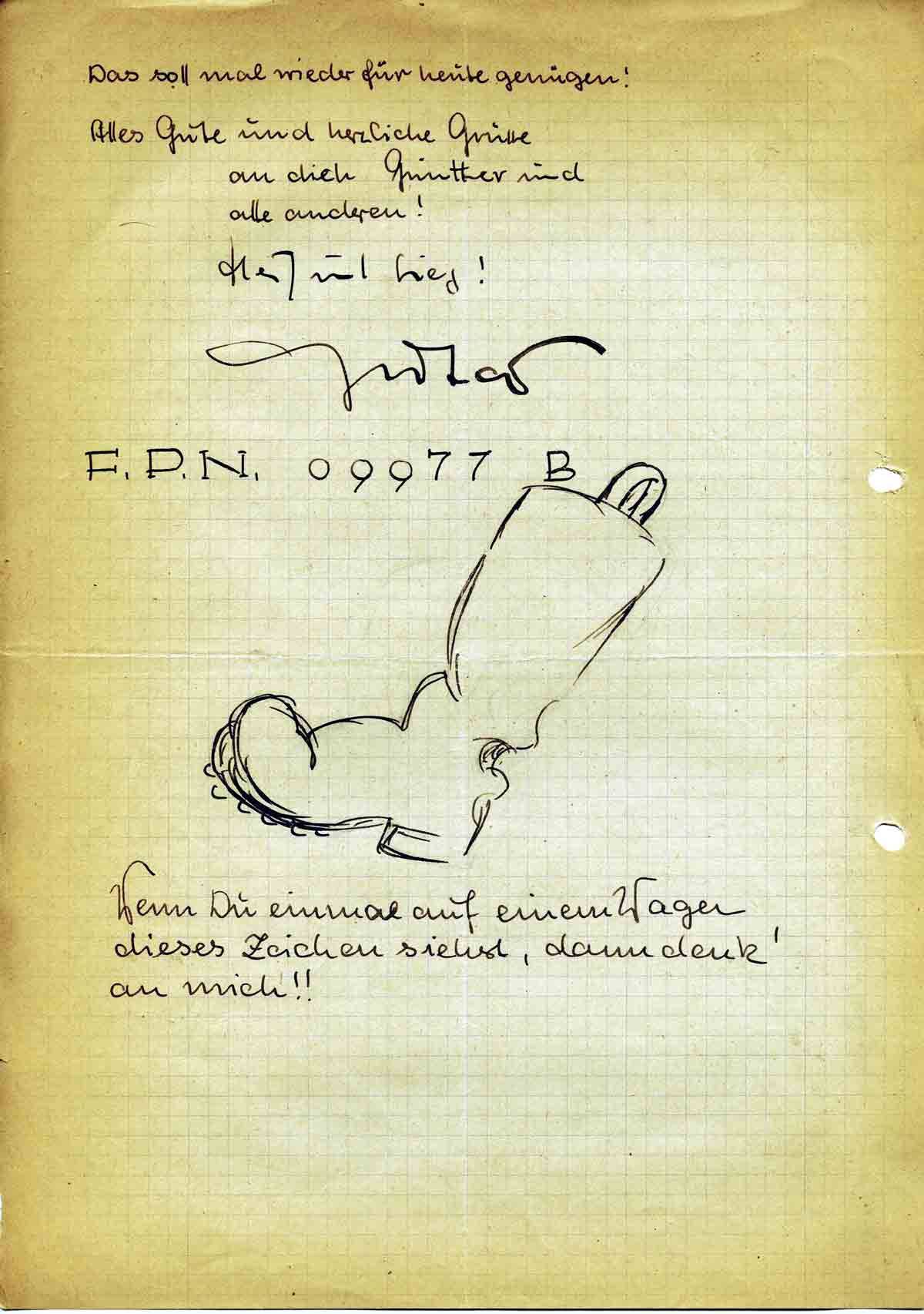 Noch etwas zu den Briefen! So weit es geht, werde ich versuchen Euch und Vater immer regelmässig zu schreiben. Und wenn mal ein paar Tage nichts kommt, so denke nicht sofort, ich wäre schon geplatzt. Ich bin eben Soldat. Und ausserdem ist Krieg. Den lieben Verwandten teile bitte schonend mit, dass ich sie nicht mehr mit soviel Briefen, wie bisher beglücken könne. Wenn es geht, werde ich Ihnen natürlich auch schreiben.