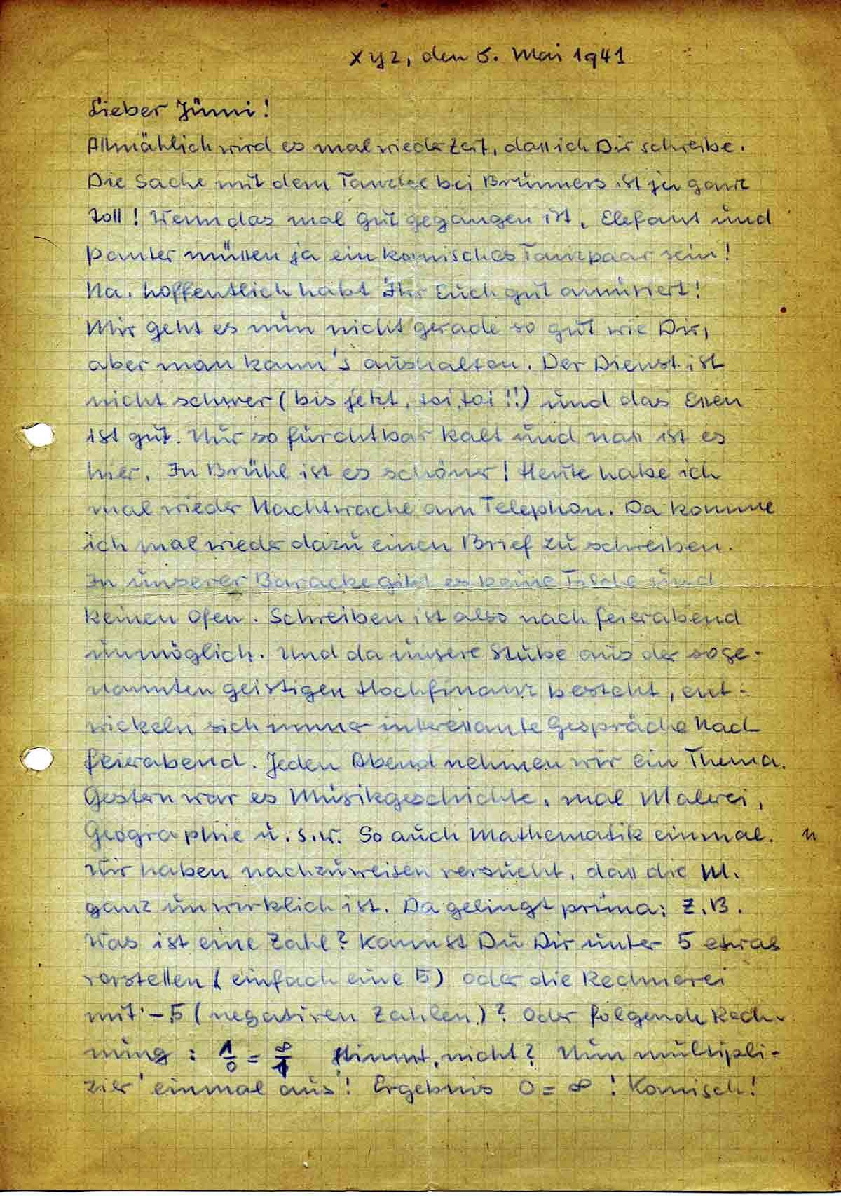 Mir geht es nun nicht gerade so gut wie Dir, aber man kann’s aushalten. Der Dienst ist nicht schwer (bis jetzt, toi, toi!!) und das Essen ist gut. Nur so furchtbar kalt und nass ist es hier. In Brühl ist es schöner! Heute habe ich mal wieder Nachtwache am Telephon. Da komme ich mal wieder dazu einen Brief zu schreiben. In unserer Baracke gibt es keine Tische und keinen Ofen. Schreiben ist also nach Feierabend unmöglich. Und da unsere Stube aus der sogenannten geistigen Hochfinanz besteht, entwickeln sich immer interessante Gespräche nach Feierabend. Jeden Abend nehmen wir ein Thema. Gestern war es Musikgeschichte, mal Malerei, Geographie u. s. w. So auch Mathematik einmal. Wir haben nachzuweisen versucht, dass die M. ganz unwirklich ist. Da gelingt prima: z. B. Was ist eine Zahl? Kannst Du Dir unter 5 etwas vorstellen (einfach eine 5) oder die Rechnerei mit -5 (negativen Zahlen)? Oder folgende Rechnung: 1/0 = ~/1 Stimmt, nicht? Nun multiplizier’ einmal aus: Ergebnis 0 = ~! Komisch!