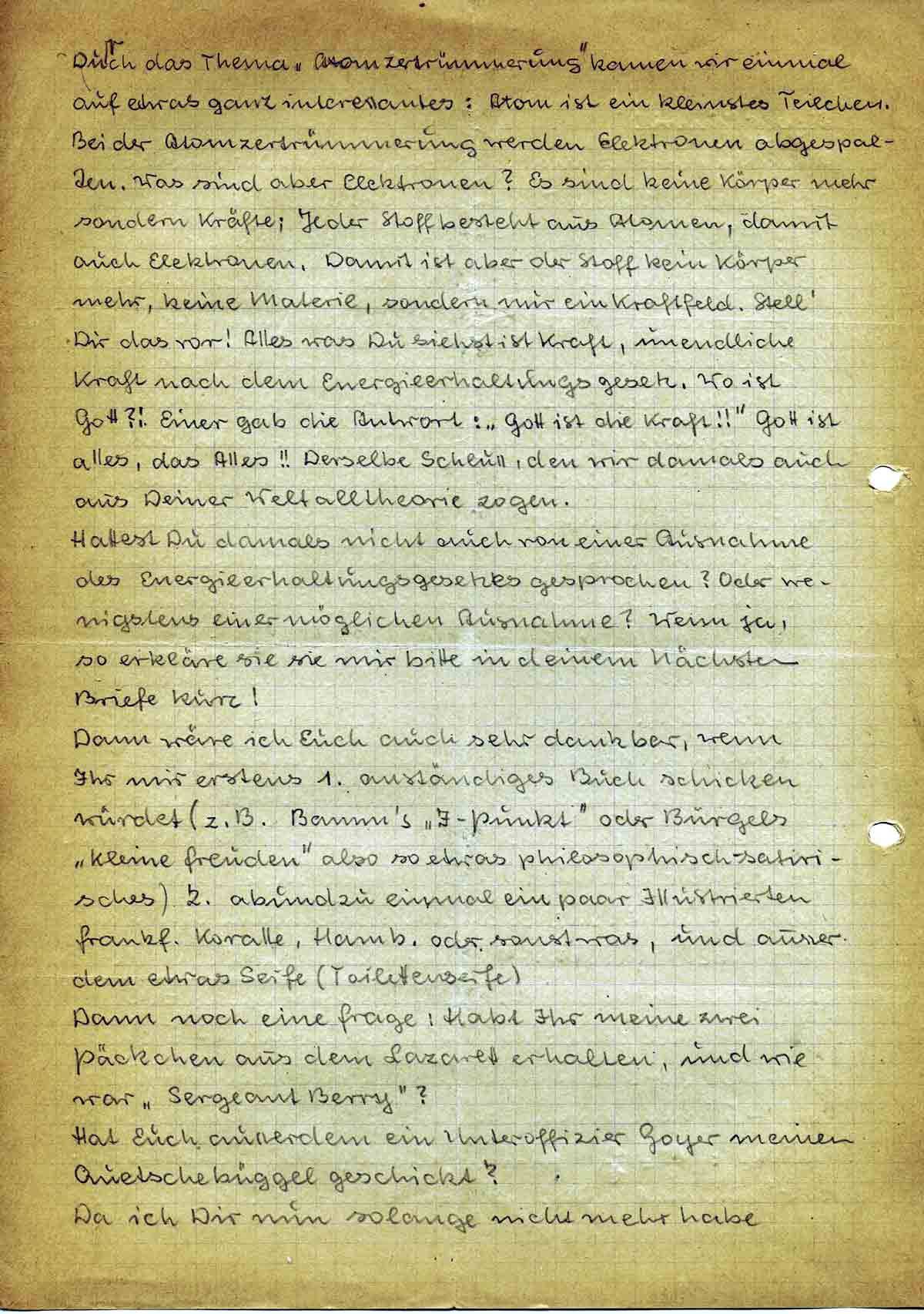 Dann wäre ich Euch auch sehr dankbar, wenn Ihr mir erstens 1 anständiges Buch schicken würdet (z. B. Bamm’s „I-Punkt“ oder Burgels „Kleine Freuden“ also so etwas philosophisch-satirisches) 2. ab und zu einmal ein paar Illustrierten Frankf. Koralle, Hamb. oder sonst was, und ausserdem etwas Seife (Toilettenseife)