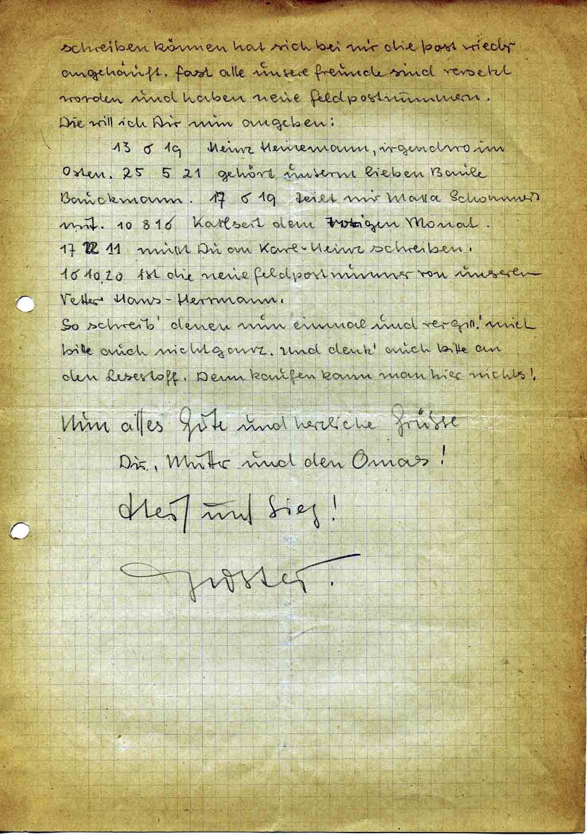 13 6 19 Heinz Heinemann, irgendwo im Osten. 25 5 21 gehört unserm lieben Baule Bauckmann. 17 6 19 teilt mir Massa Schommers mit. 10 8 16 Karl seit dem vorigen Monat. 17 22 11 musst Du an Karl-Heinz schreiben. 16 10 20 ist die neue Feldpostnummer von unserem Vetter Hans-Herrmann.