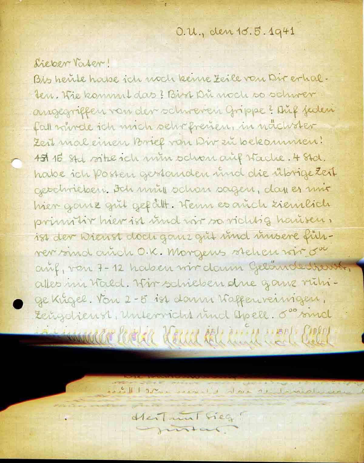 Bis heute habe ich noch keine Zeile von Dir erhalten. Wie kommt das? Bist Du noch so schwer angegriffen von der schweren Grippe? Auf jeden Fall würde ich mich sehr freuen, in nächster Zeit mal einen Brief von Dir zu bekommen! 15 Std sitze ich nun schon auf Wache. 4 Std. habe ich Posten gestanden und die übrige Zeit geschrieben. Ich muss schon sagen, dass es mir hier ganz gut gefällt. Wenn es auch ziemlich primitiv hier ist und wir so richtig hausen, ist der Dienst doch ganz gut und unsere Führer sind auch O. K. Morgens stehen wir 6.00 auf, von 7-12 haben wir dann Geländedienst, alles im Wald. Wir schieben eine ganz ruhige Kugel. Von 2-5 ist dann Waffenreinigen, Zeugdienst, Unterricht und Apell. 6.00 sind