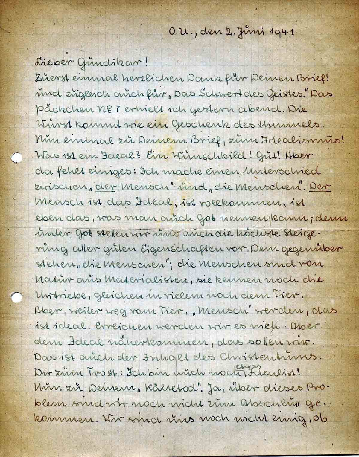 Zuerst einmal herzlichen Dank für Deinen Brief! und zugleich auch für „Das Schwert des Geistes“. Das Päckchen No. 7 erhielt ich gestern abend. Die Wurst kommt wie ein Geschenk des Himmels. Nun einmal zu Deinem Brief, zum Idealismus! Was ist ein Ideal? Ein Wunschbild! Gut! Aber da fehlt einiges: Ich mache einen Unterschied zwischen „der Mensch“ und „die Menschen“. Der Mensch ist das Ideal, ist vollkommen, ist eben das, was man auch Gott nennen kann; denn unter Gott stellen wir uns auch die höchste Steigerung aller guten Eigenschaften vor. Dem gegenüber stehen „die Menschen“; die Menschen sind von Natur aus Materialisten, sie kennen noch die Urtriebe, gleichen in vielem noch dem Tier. Aber, weiter weg vom Tier, „Mensch“ werden, das ist ideal. Erreichen werden wir es nie. Aber dem Ideal näherkommen, das sollen wir. Das ist auch der Inhalt des Christentums. Dir zum Trost: Ich bin auch noch etwas Idealist! Nun zu Deinem „Kältetod“. Ja, über dieses Problem sind wir noch nicht zum Abschluß gekommen. Wir sind uns noch nicht einig, ob
