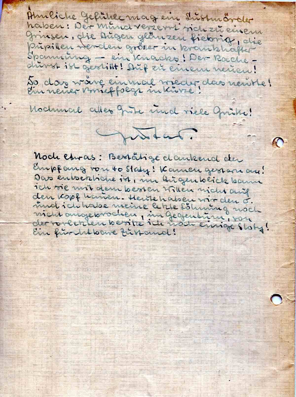 Noch etwas: Bestätige dankend den Empfang von 40 Sloty! Kamen gestern an! Das entsetzliche ist, im Augenblick kann ich sie mit dem besten Willen nicht auf den Kopf hauen. Heute haben wir den 6. und ich habe meine letzte Löhnung noch nicht angebrochen, im Gegentum, von der vorletzten besitze ich noch einige Sloty! Ein furchtbare Zustand!