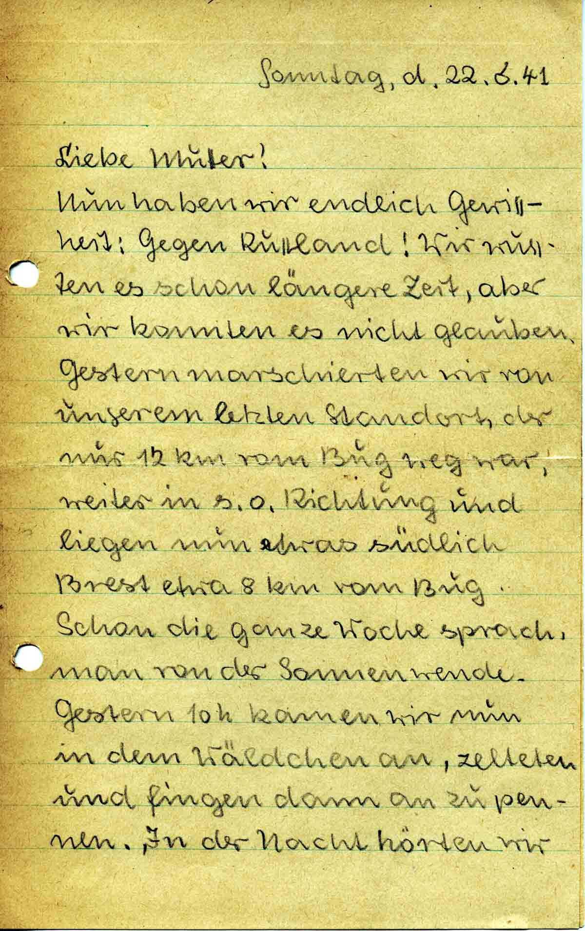 Nun haben wir endlich Gewissheit: Gegen Russland! Wir wussten es schon längere Zeit, aber wir konnten es nicht glauben. Gestern marschierten wir von unserem letzten Standort, der nur 12 km vom Bug weg war, weiter in s. o. Richtung und liegen nun etwas südlich Brest etwa 8 km vom Bug. Schon die ganze Woche sprach man von der Sonnenwende. Gestern 10 h kamen wir nun in dem Wäldchen an, zelteten und fingen dann an zu pennen. In der Nacht hörten wir