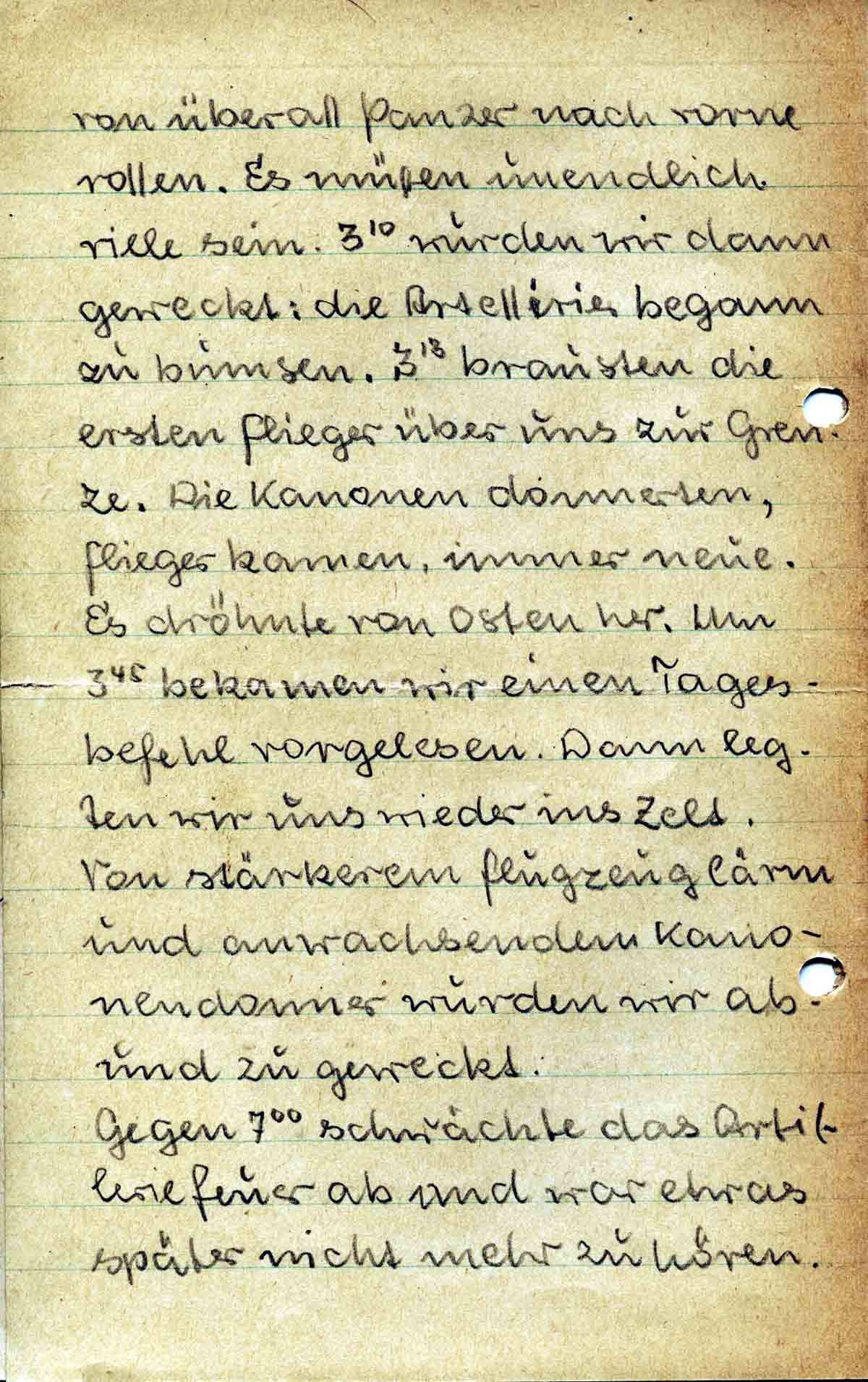 von überall Panzer nach vorne rollen. Es müssen unendlich viele sein. 3.10 wurden wir dann geweckt: die Artellerie begann zu bumsen. 3.18 brausten die ersten Flieger über uns zur Grenze. Die Kanonen donnerten, Flieger kamen, immer neue. Es dröhnte von Osten her. Um 3.45 bekamen wir einen Tagesbefehl vorgelesen. Dann legten wir uns wieder ins Zelt. Von stärkerem Flugzeuglärm und anwachsendem Kanonendonner wurden wir ab und zu geweckt.