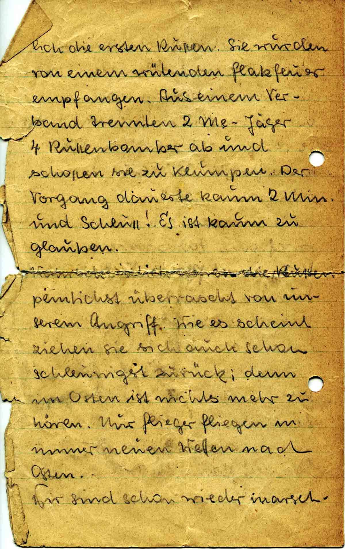 lich die ersten Russen. Sie wurden von einem wütenden Flakfeuer empfangen. Aus einem Verband trennten 2 Me-Jäger 4 Russenbomber ab und schossen sie zu Klumpen. Der Vorgang dauerte kaum 2 Min. und Schluss! Es ist kaum zu glauben.