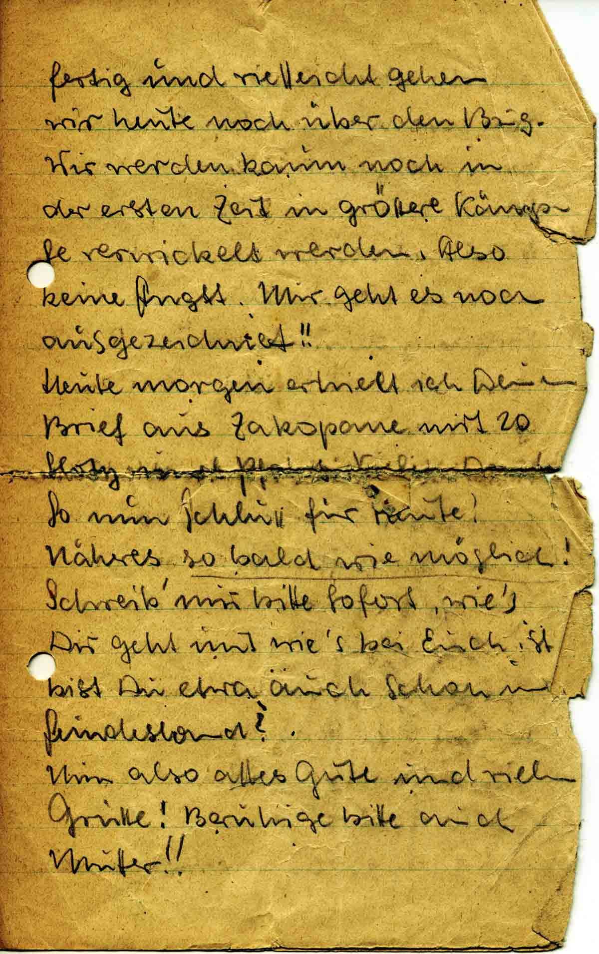Heute morgen erhielt ich Deinen Brief aus Zakopane mit 20 Sloty [...] Vielen Dank! So nun Schluss für Heute!