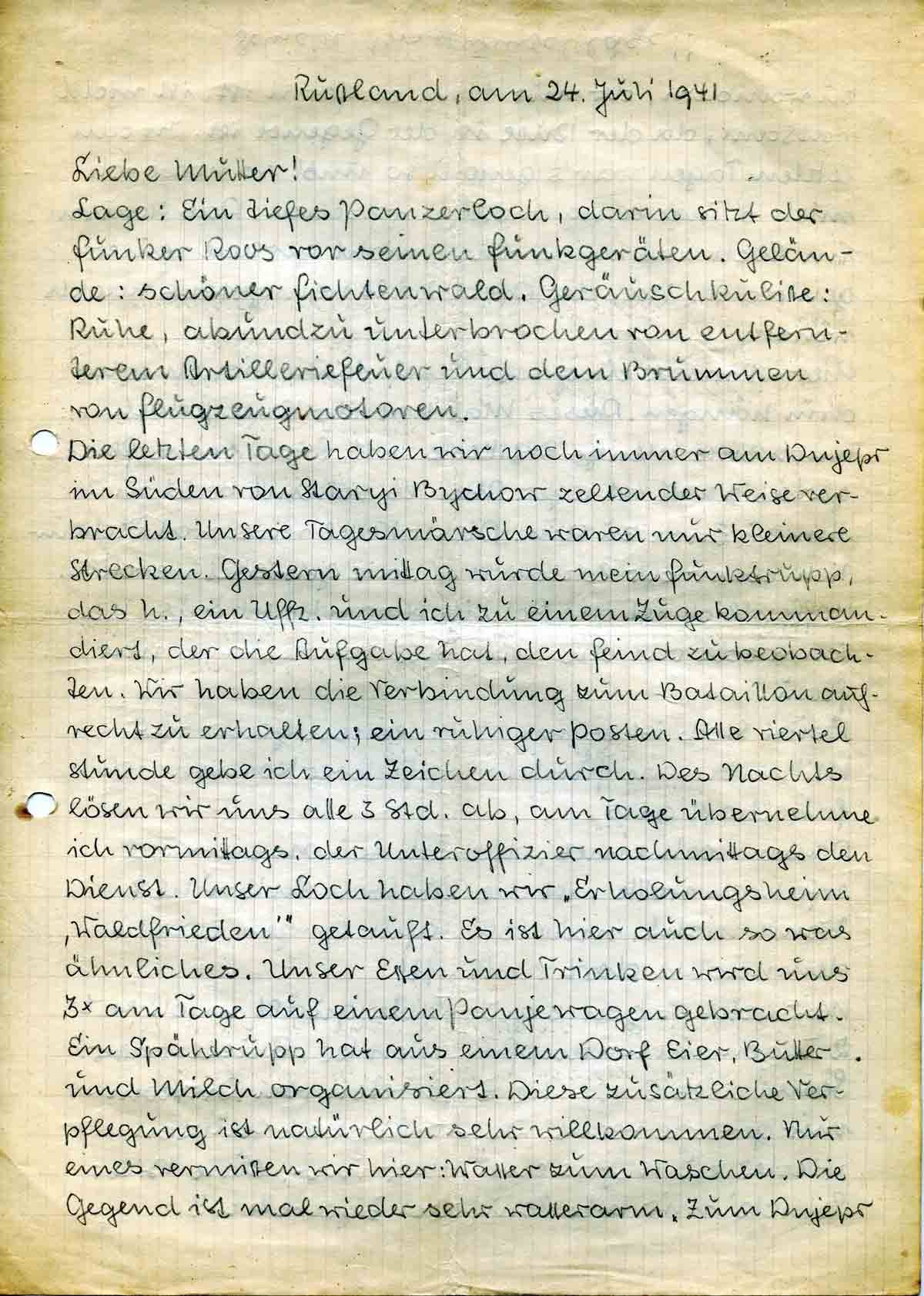 Die letzten Tage haben wir noch immer am Dnjepr im Süden von Staryi Bychow zeltender Weise verbracht. Unsere Tagesmärsche waren nur kleinere Strecken. Gestern mittag wurde mein Funktrupp, das h., ein Uffz. und ich zu einem Zuge kommandiert, der die Aufgabe hat, den Feind zu beobachten. Wir haben die Verbindung zum Bataillon aufrecht zu erhalten; ein ruhiger Posten. Alle viertel Stunde gebe ich ein Zeichen durch. Des Nachts lösen wir uns alle 3 Std. ab, am Tage übernehme ich vormittags, der Unteroffizier nachmittags den Dienst. Unser Loch haben wir „Erholungsheim ’Waldfrieden’“ getauft. Es ist hier auch so was ähnliches. Unser Essen und Trinken wird uns 3 x am Tage auf einem Panjewagen gebracht. Ein Spähtrupp hat aus einem Dorf Eier, Butter und Milch organisiert. Diese zusätzliche Verpflegung ist natürlich sehr willkommen. Nur eines vermissen wir hier: Wasser zum Waschen. Die Gegend ist mal wieder sehr wasserarm. Zum Dnjepr