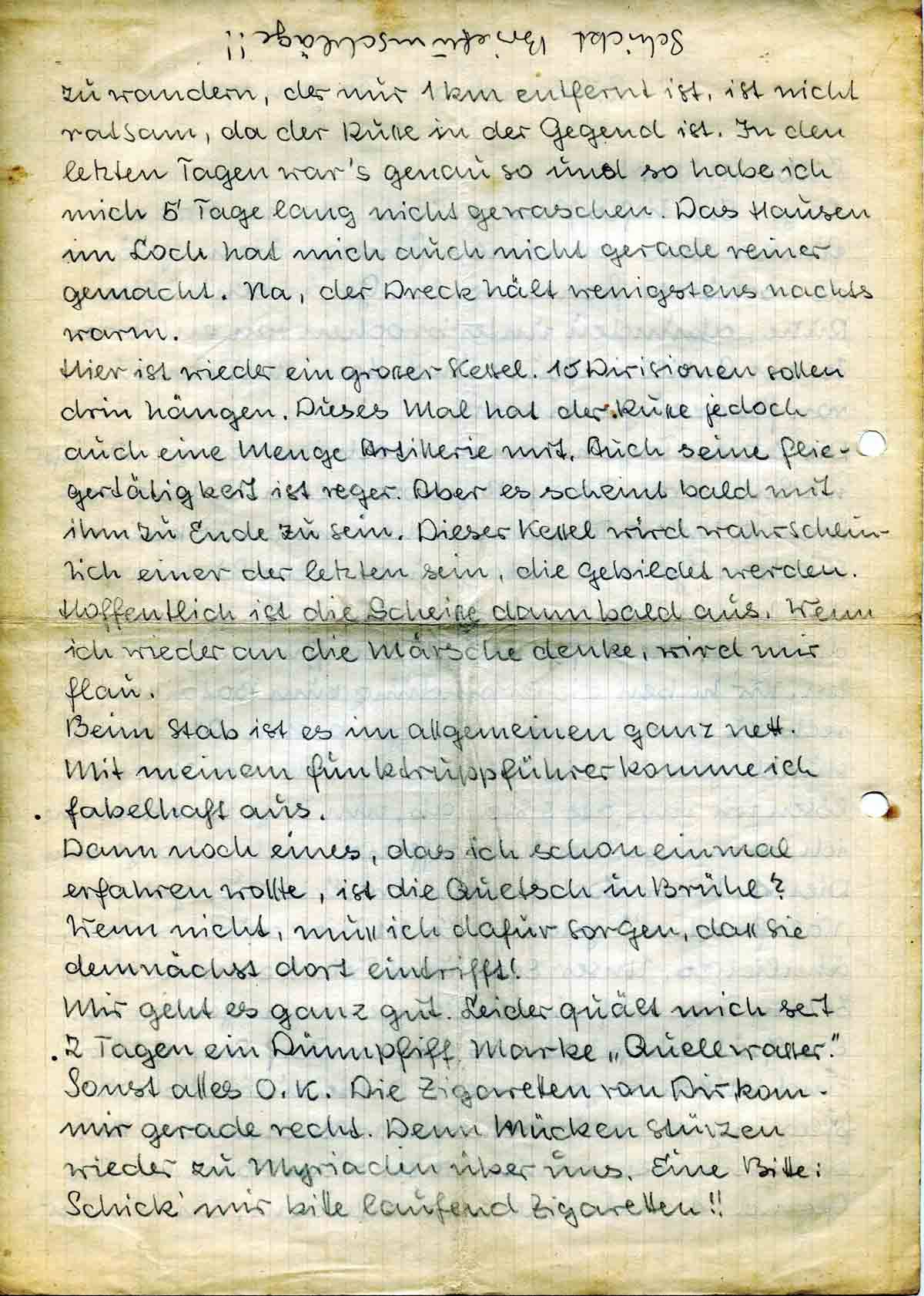 Mir geht es ganz gut. Leider quält mich seit 2 Tagen ein Dünnpfiff Marke „Quellwasser“. Sonst alles O. K. Die Zigaretten von Dir kam mir gerade recht. Denn Mücken stürzen wieder zu Myriaden über uns. Eine Bitte: Schick’ mir bitte laufend Zigaretten!!