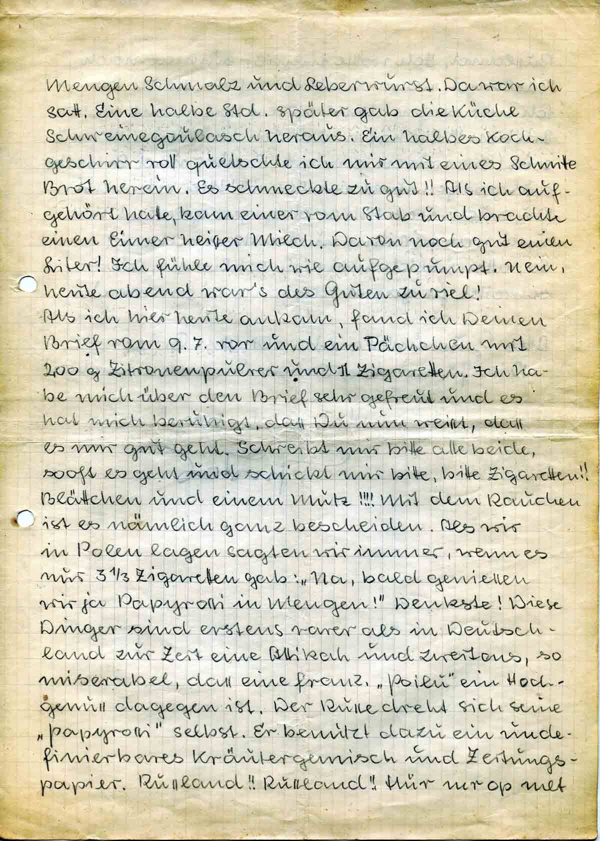 Als ich hier heute ankam, fand ich Deinen Brief vom 9.7. vor und ein Päckchen mit 200 g Zitronenpulver und 11 Zigaretten. Ich habe mich über den Brief sehr gefreut und es hat mich beruhigt, dass Du nun weisst, dass es mir gut geht. Schreibt mir bitte alle beide, sooft es geht und schickt mir bitte, bitte Zigaretten!! Blättchen und einem Mutz!!!! Mit dem Rauchen ist es nämlich ganz bescheiden. Als wir in Polen lagen sagten wir immer, wenn es nur 3 1/3 Zigaretten gab: „Na, bald geniessen wir ja Papyrossi in Mengen!“ Denkste! Diese Dinger sind erstens rarer als in Deutschland zur Zeit eine Attikah und zweitens, so miserabel, dass eine franz. „Poilu“ ein Hochgenuss dagegen ist. Der Russe dreht sich seine „Papyrossi“ selbst. Er benutzt dazu ein undefinierbares Kräutergemisch und Zeitungspapier. Russland!! Russland!! Hür mr op met