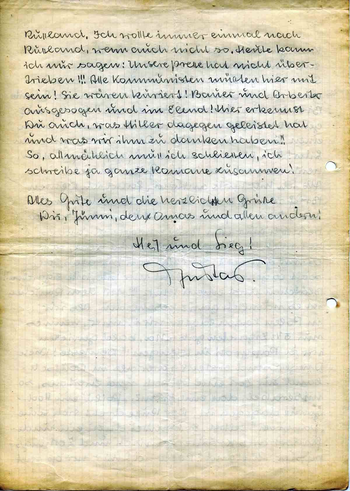 Russland. Ich wollte immer einmal nach Russland, wenn auch nicht so. Heute kann ich nur sagen: Unsere Presse hat nicht übertrieben!!! Alle Kommunisten müssten hier mit sein! Sie wären kuriert! Bauer und Arbeiter ausgesogen und im Elend! Hier erkennst Du auch, was Hitler dagegen geleistet hat und was wir ihm zu danken haben!!