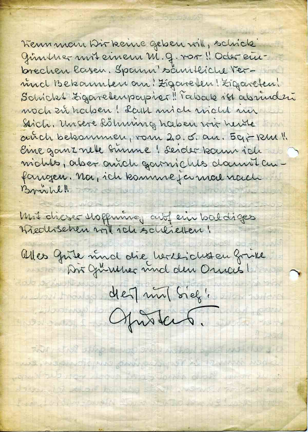 Wenn man Dir keine geben will, schick Günther mit einem M.G. vor!! Oder einbrechen lassen. Spann’ sämtliche Ver- und Bekannten ein! Zigaretten! Zigaretten! Schickt Zigarettenpapier!! Tabak ist ab und zu noch zu haben! Lasst mich nicht im Stich. Unsere Löhnung haben wir heute auch bekommen, vom 20.6. an. 59,- Rm!! Eine ganz nette Summe! Leider kann ich nichts, aber auch garnichts damit anfangen. Na, ich komme ja mal nach Brühl!!