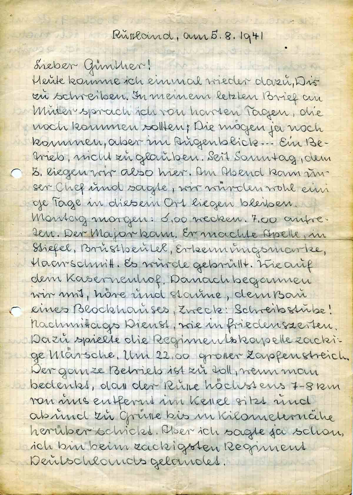 Heute komme ich einmal wieder dazu, Dir zu schreiben. In meinem letzten Brief an Mutter sprach ich von harten Tagen, die noch kommen sollten. Die mögen ja noch kommen, aber im Augenblick - - - Ein Betrieb, nicht zu glauben. Seit Sonntag, dem 3. liegen wir also hier. Am Abend kam unser Chef und sagte, wir würden wohl einige Tage in diesem Ort liegen bleiben. Montag morgen: 6.00 wecken. 7.00 antreten. Der Major kam. Er machte Apelle, in Stiefel, Brustbeutel, Erkennungsmarke, Haarschnitt. Es wurde gebrüllt. Wie auf dem Kasernenhof. Danach begannen wir mit, höre und staune, dem Bau eines Blockhauses, Zweck: Schreibstube! Nachmittags Dienst, wie in Friedenszeiten. Dazu spielte die Regimentskapelle zackige Märsche. Um 22.00 grosser Zapfenstreich. Der ganze Betrieb ist zu toll, wenn man bedenkt, dass der Russe höchstens 7-8 km von uns entfernt im Kessel sitzt und ab und zu Grüsse bis in Kilometernähe herüber schickt. Aber ich sagte ja schon, ich bin beim zackigsten Regiment Deutschlands gelandet.