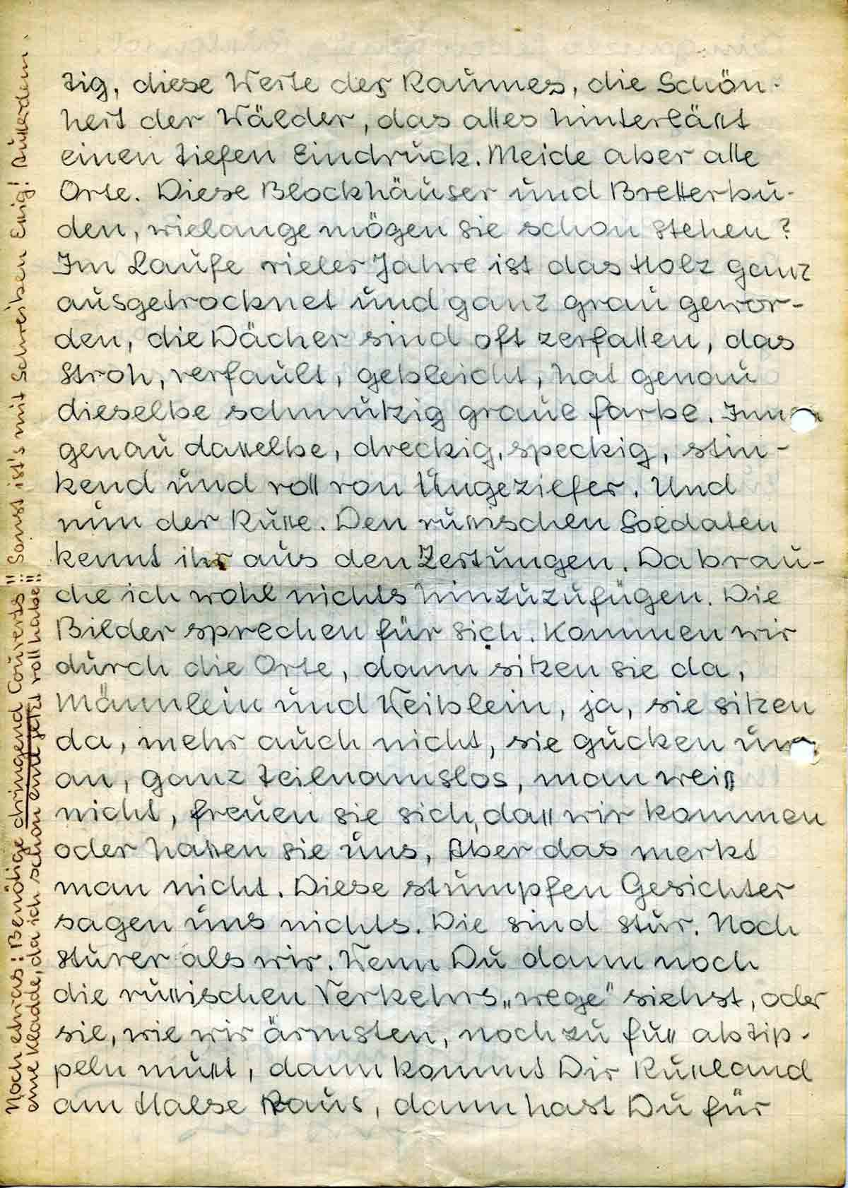 tig, diese Weite des Raumes, die Schönheit der Wälder, das alles hinterlässt einen tiefen Eindruck. Meide aber alle Orte. Diese Blockhäuser und Bretterbuden, wielange mögen sie schon stehen? Im Laufe vieler Jahre ist das Holz ganz ausgetrocknet und ganz grau geworden, die Dächer sind oft zerfallen, das Stroh, verfault, gebleicht, hat genau dieselbe schmutzig graue Farbe. Innen genau dasselbe, dreckig, speckig, stinkend und voll von Ungeziefer. Und nun der Russe. Den russischen Soldaten kennt ihr aus den Zeitungen. Da brauche ich wohl nichts hinzuzufügen. Die Bilder sprechen für sich. Kommen wir durch die Orte, dann sitzen sie da, Männlein und Weiblein, ja, sie sitzen da, mehr auch nicht, sie gucken uns an, ganz teilnamslos, man weiss nicht, freuen sie sich, dass wir kommen oder hassen sie uns. Aber das merkt man nicht. Diese stumpfen Gesichter sagen uns nichts. Die sind stur. Noch sturer als wir. Wenn Du dann noch die russischen Verkehrs“wege“ siehst, oder sie, wie wir ärmsten, noch zu Fuss abtippeln musst, dann kommt Dir Russland am Halse raus, dann hast Du für
