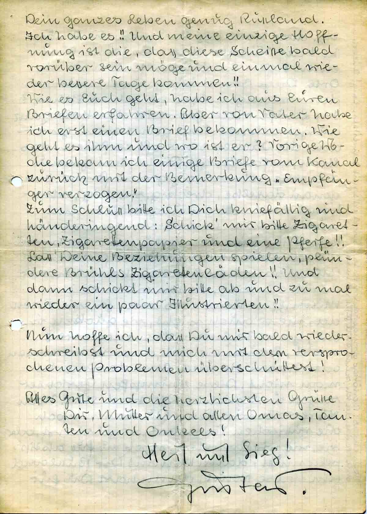 Zum Schluss bitte ich Dich kniefällig und händeringend: Schick’ mir bitte Zigaretten, Zigarettenpapier und eine Pfeife!! Lass Deine Beziehungen spielen, plündere Brühls Zigarettenläden!! Und dann schickt mir bitte ab und zu mal wieder ein paar Illustrierten!!