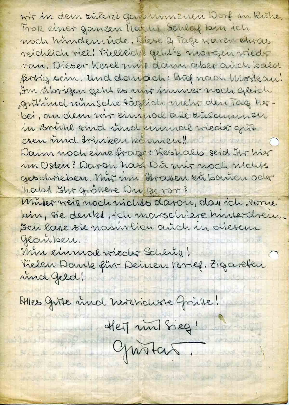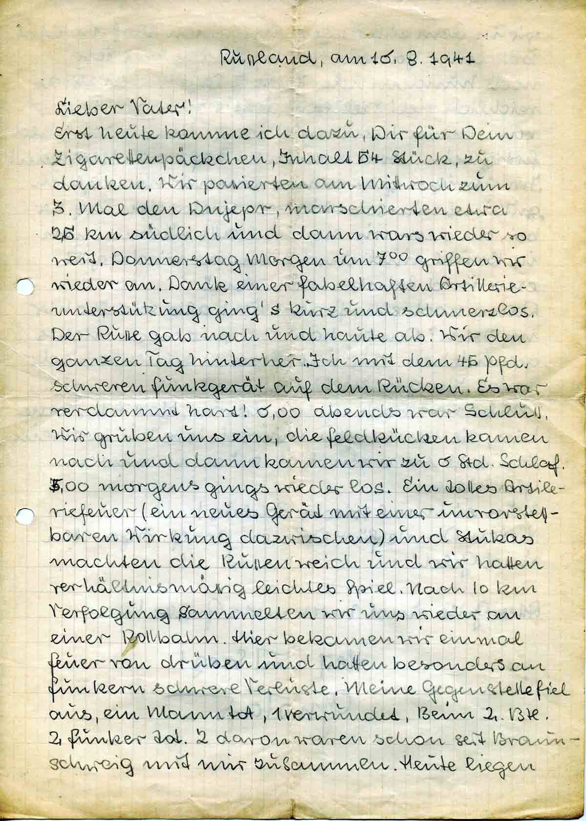 Erst heute komme ich dazu, Dir für Dein Zigarettenpäckchen, Inhalt 54 Stück, zu danken. Wir passierten am Mittwoch zum 3. Mal den Dnjepr, marschierten etwa 25 km südlich und dann wars wieder so weit. Donnerstag Morgen um 7.00 griffen wir wieder an. Dank einer fabelhaften Artillerieunterstützung ging’s kurz und schmerzlos. Der Russe gab nach und haute ab. Wir den ganzen Tag hinterher. Ich mit dem 45 Pfd. schweren Funkgerät auf dem Rücken. Es war verdammt hart! 6.00 abends war Schluss. Wir gruben uns ein, die Feldküchen kamen nach und dann kamen wir zu 6 Std. Schlaf. 5.00 morgens gings wieder los. Ein tolles Artilleriefeuer (ein neues Gerät mit einer unvorstellbaren Wirkung dazwischen) und Stukas machten die Russen weich und wir hatten verhältnismässig leichtes Spiel. Nach 10 km Verfolgung sammelten wir uns wieder an einer Rollbahn. Hier bekamen wir einmal Feuer von drüben und hatten besonders an Funkern schwere Verluste. Meine Gegenstelle fiel aus, ein Mann tot, 1 verwundet. Beim 2. Btl. 2 Funker tot. 2 davon waren schon seit Braunschweig mit mir zusammen. Heute liegen