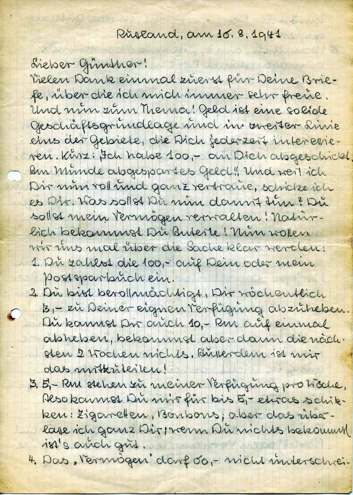 2. Du bist bevollmächtigt, Dir wöchentlich 3,- zu Deiner eignen Verfügung abzuheben. Du kannst Dir auch 10,- Rm auf einmal abheben, bekommst aber dann die nächsten 2 Wochen nichts. Ausserdem ist mir das mitzuteilen!