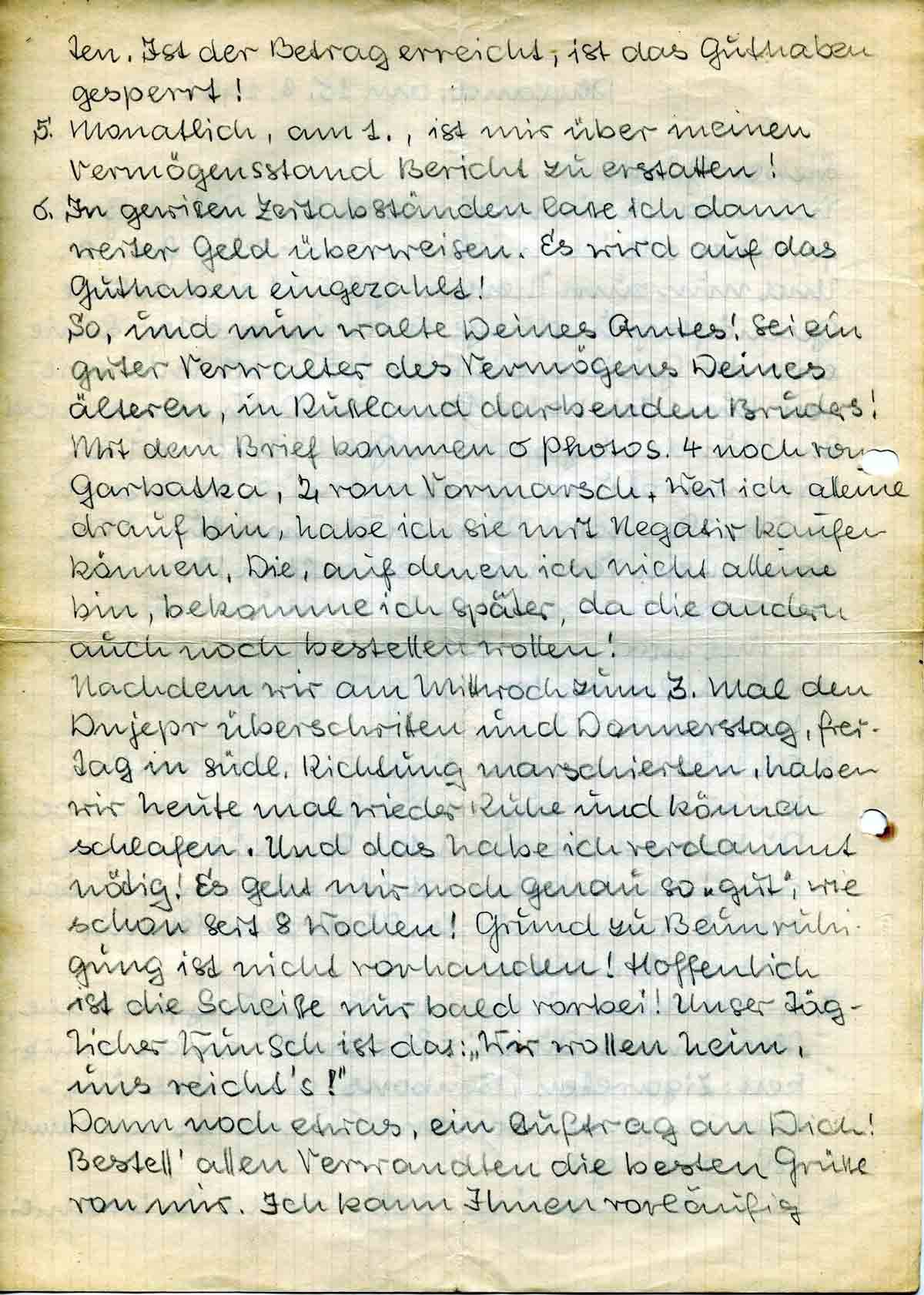 So, und nun walte Deines Amtes! Sei ein guter Verwalter des Vermögens Deines älteren, in Russland darbenden Bruders! Mit dem Brief kommen 6 Photos. 4 noch von Garbatka, 2 vom Vormarsch. Weil ich alleine drauf bin, habe ich sie mit Negativ kaufen können. Die, auf denen ich nicht alleine bin, bekomme ich später, da die andern auch noch bestellen wollen!