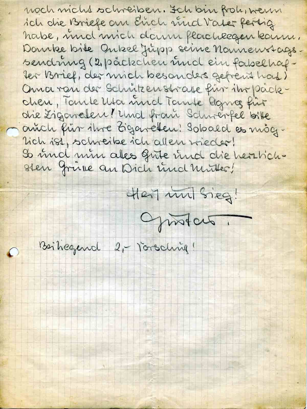 noch nicht schreiben. Ich bin froh, wenn ich die Briefe an Euch und Vater fertig habe, und mich dann flachlegen kann. Danke bitte Onkel Jupp seine Namenstagssendung (2 Päckchen und ein fabelhafter Brief, der mich besonders gefreut hat) Oma von der Schützenstrasse für ihr Päckchen, Tante Uta und Tante Agnes für die Zigaretten! Und Frau Schwerfel bitte auch für ihre Zigaretten! Sobald es möglich ist, schreibe ich allen wieder!