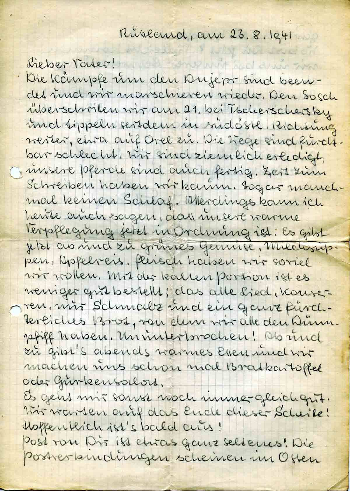 Die Kämpfe um den Dnjepr sind beendet und wir marschieren wieder. Den Sosch überschritten wir am 21. bei Tscherschersky und tippeln seitdem in südöstl. Richtung weiter, etwa auf Orel zu. Die Wege sind furchtbar schlecht. Wir sind ziemlich erledigt, unsere Pferde sind auch fertig. Zeit zum Schreiben haben wir kaum. Sogar manchmal keinen Schlaf. Allerdings kann ich heute auch sagen, dass unsere warme Verpflegung jetzt in Ordnung ist: Es gibt jetzt ab und zu grünes Gemüse, Milchsuppe, Apfelreis. Fleisch haben wir soviel wir wollen. Mit der kalten Portion ist es weniger gut bestellt: das alte Lied, Konserven, nur Schmalz und ein ganz fürchterliches Brot, von dem wir alle den Dünnpfiff haben. Ununterbrochen! Ab und zu gibt’s abends warmes Essen und wir machen uns schon mal Bratkartoffel oder Gurkensalat.