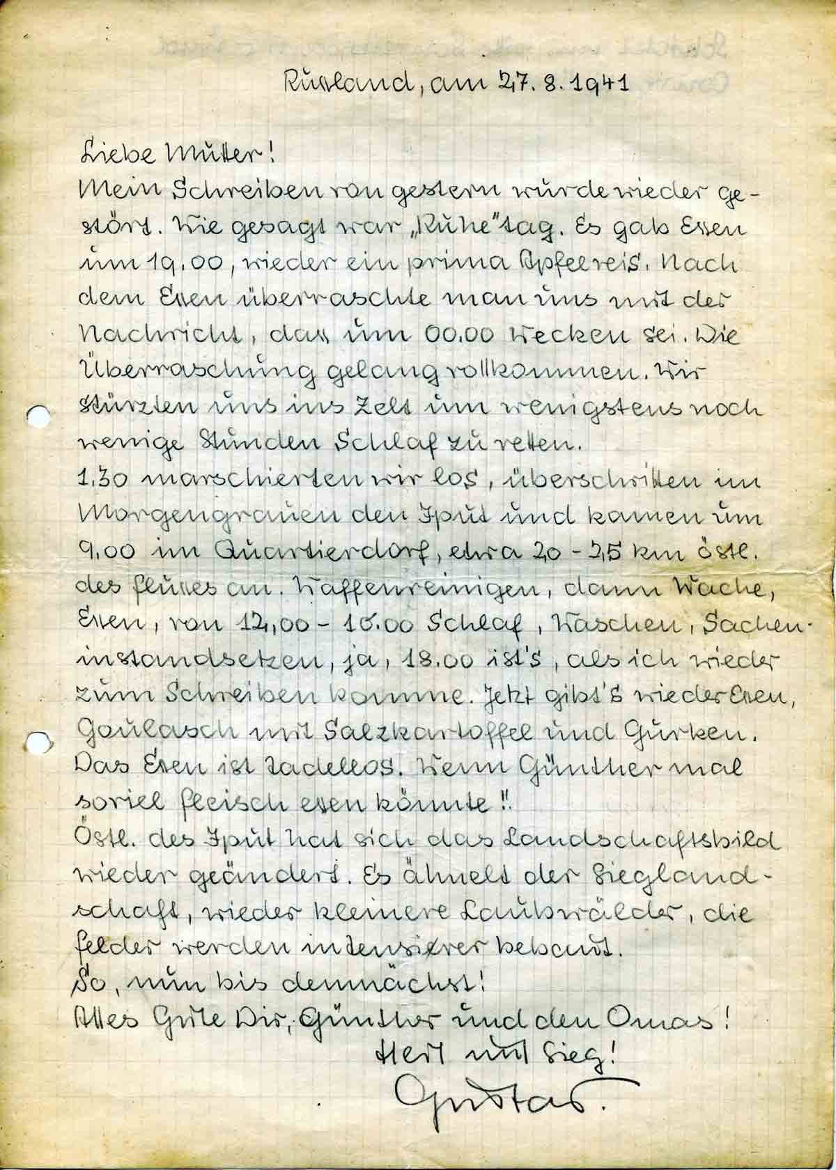 Gustav Roos an Mutter Elisabeth, 27. August 1941