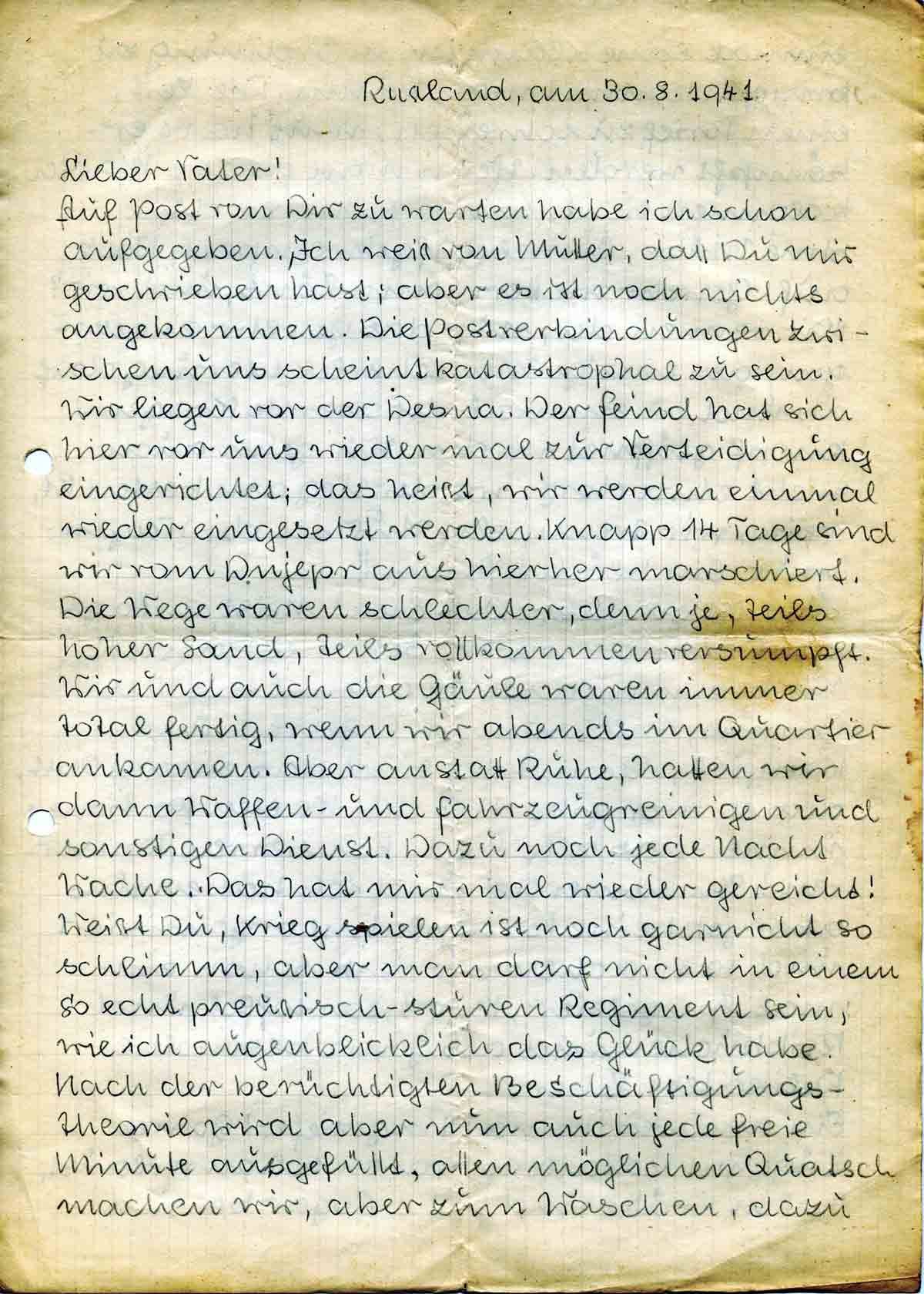 Auf Post von Dir zu warten habe ich schon aufgegeben. Ich weiss von Mutter, dass Du mir geschrieben hast; aber es ist noch nichts angekommen. Die Postverbindungen zwischen uns scheint katastrophal zu sein. Wir liegen vor der Desna. Der Feind hat sich hier vor uns wieder mal zur Verteidigung eingerichtet; das heisst, wir werden einmal wieder eingesetzt werden. Knapp 14 Tage sind wir vom Dnjepr aus hierher marschiert. Die Wege waren schlechter, denn je, teils hoher Sand, teils vollkommen versumpft. Wir und auch die Gäule waren immer total fertig, wenn wir abends im Quartier ankamen. Aber anstatt Ruhe, hatten wir dann Waffen- und Fahrzeugreinigen und sonstigen Dienst. Dazu noch jede Nacht Wache. Das hat mir mal wieder gereicht! Weisst Du, Krieg spielen ist noch garnicht so schlimm, aber man darf nicht in einem so echt preussisch-sturen Regiment sein, wie ich augenblicklich das Glück habe. Nach der berüchtigten Beschäftigungstheorie wird aber nun auch jede freie Minute ausgefüllt, allen möglichen Quatsch machen wir, aber zum Waschen, dazu