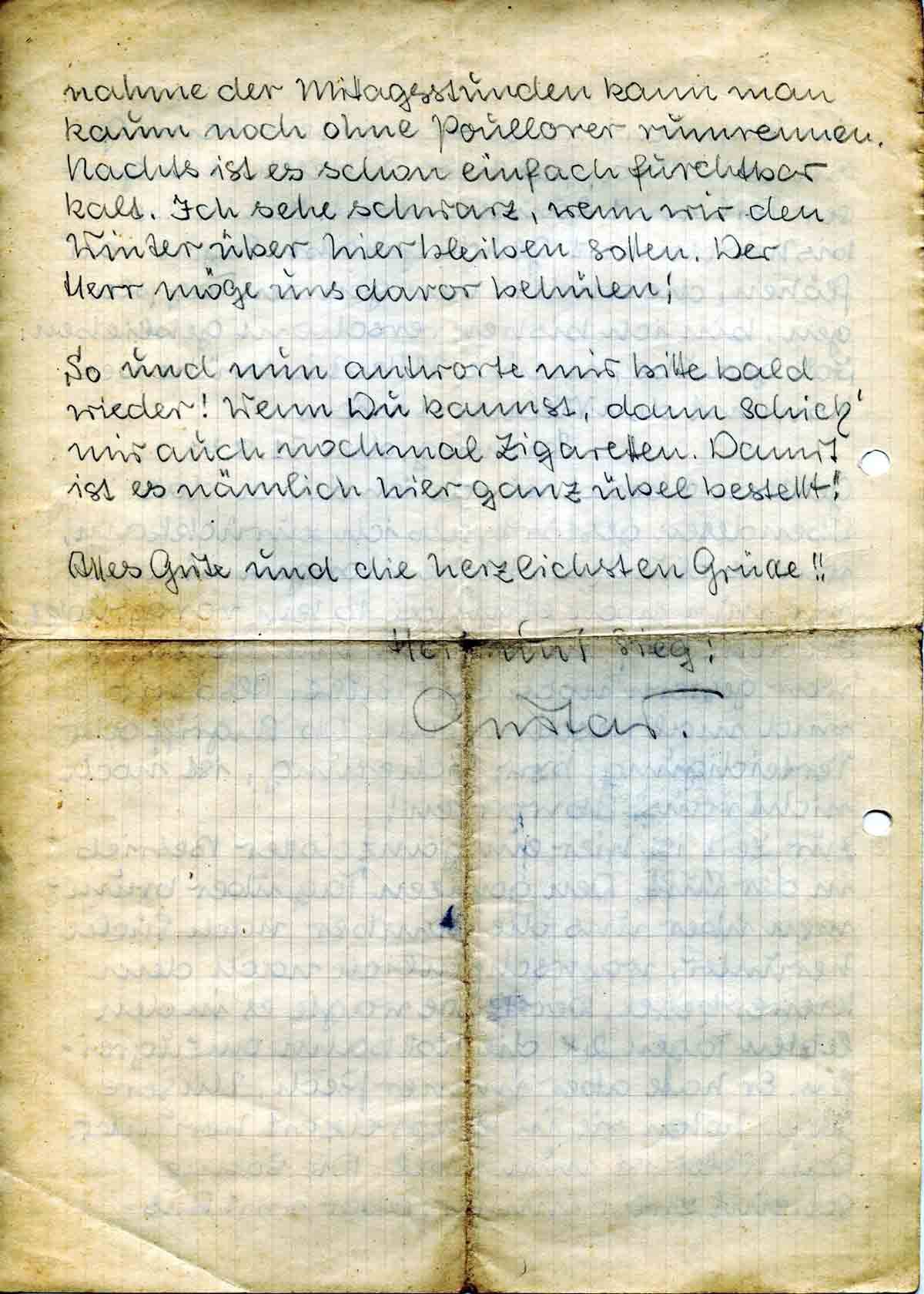So und nun antworte mir bitte bald wieder! Wenn Du kannst, dann schick’ mir auch nochmal Zigaretten. Damit ist es nämlich hier ganz übel bestellt!