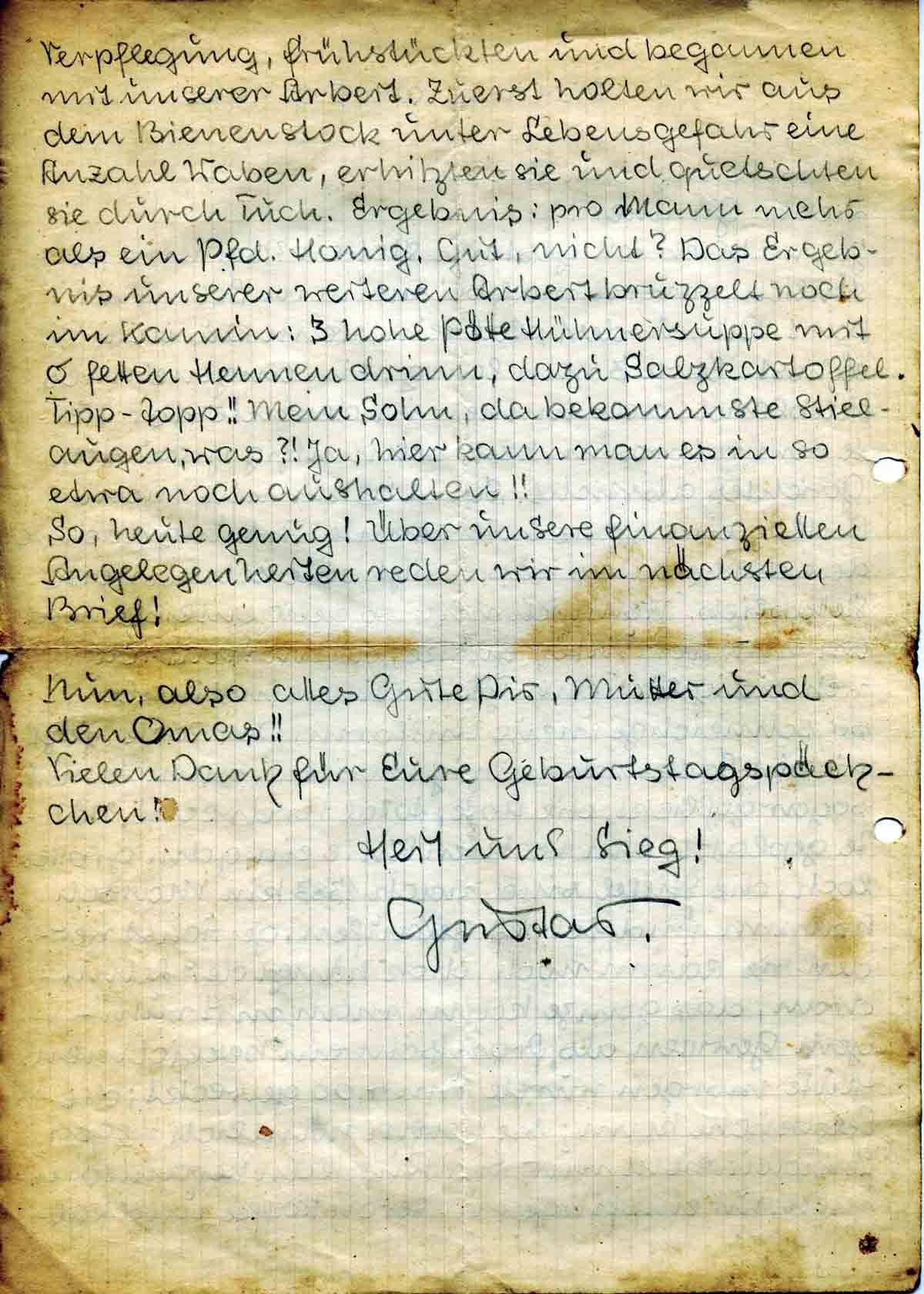 te Verpflegung, frühstückten und begannen mit unserer Arbeit. Zuerst holten wir aus dem Bienenstock unter Lebensgefahr eine Anzahl Waben, erhitzten sie und quetschten sie durch Tuch. Ergebnis: pro Mann mehr als ein Pfd. Honig. Gut, nicht? Das Ergebnis unserer weiteren Arbeit bruzzelt noch im Kamin: 3 hohe Pötte Hühnersuppe mit 6 fetten Hennen drinn, dazu Salzkartoffel. Tipp-topp!! Mein Sohn, da bekommste Stielaugen, was?! Ja, hier kann man es in so etwa noch aushalten!!