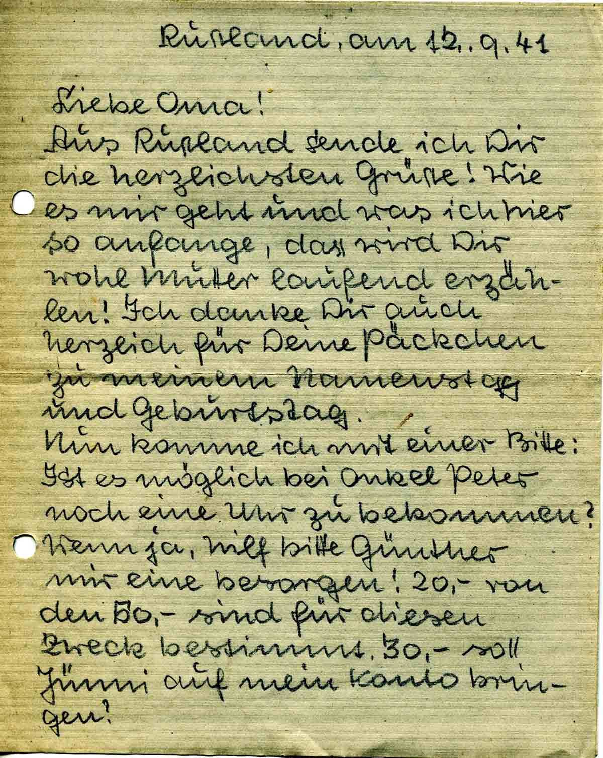 Nun komme ich mit einer Bitte: Ist es möglich bei Onkel Peter noch eine Uhr zu bekommen? Wenn ja, hilf bitte Günther mir eine besorgen! 20,- von den 50,- sind für diesen Zweck bestimmt. 30,- soll Jünni auf mein Konto bringen!