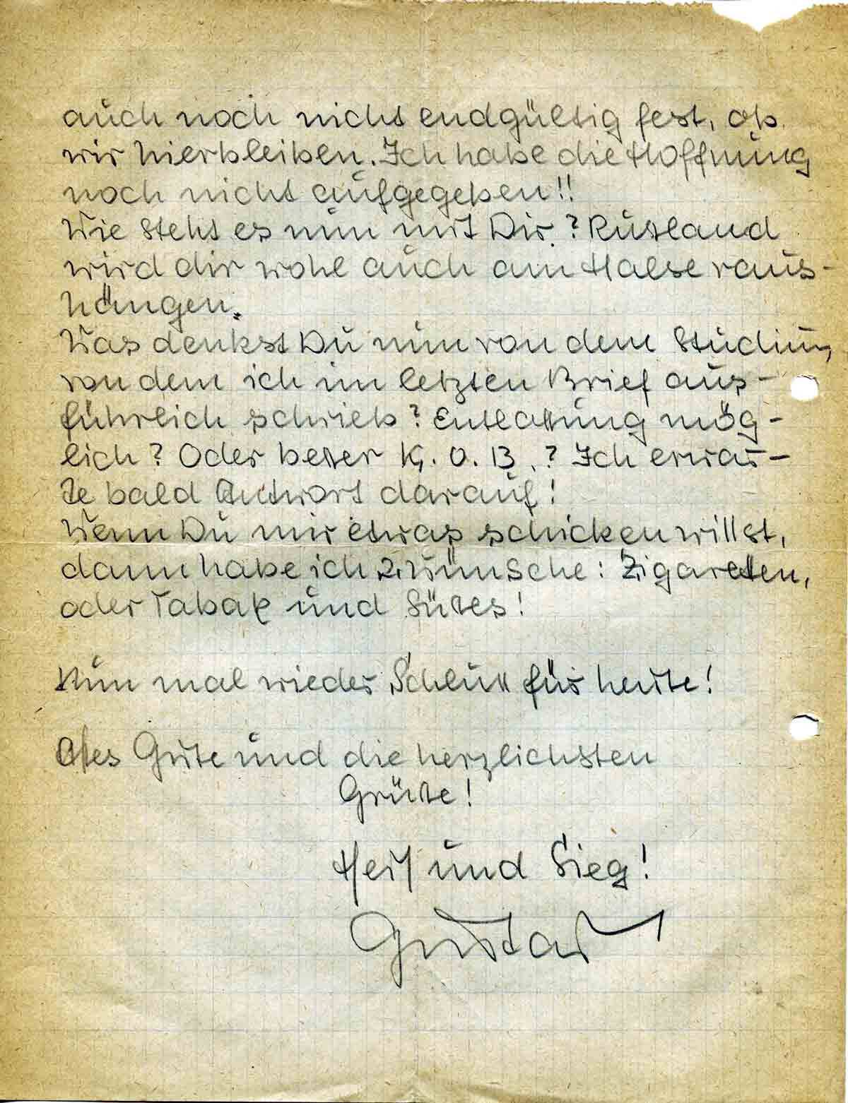 Aber, verflucht noch mal! Warum bekommst Du keine Post von mir?! Ich habe Dir den ganzen Feldzug über regelmässig geschrieben, jede Woche mindestens einmal, in letzter Zeit aber mehr. Wo bleiben dann die Briefe? Das ist mir schleierhaft!! Von heute an nummeriere ich die Post an Dich, dann haben wir eine Kontrolle, ob alles ankommt! Bei mir ist es sonst noch immer das alte. Man kann es bis heute noch aushalten. Aber, wie gesagt, wenn der Winter kommt ...!! Davor graut mir! Aber es steht ja wohl