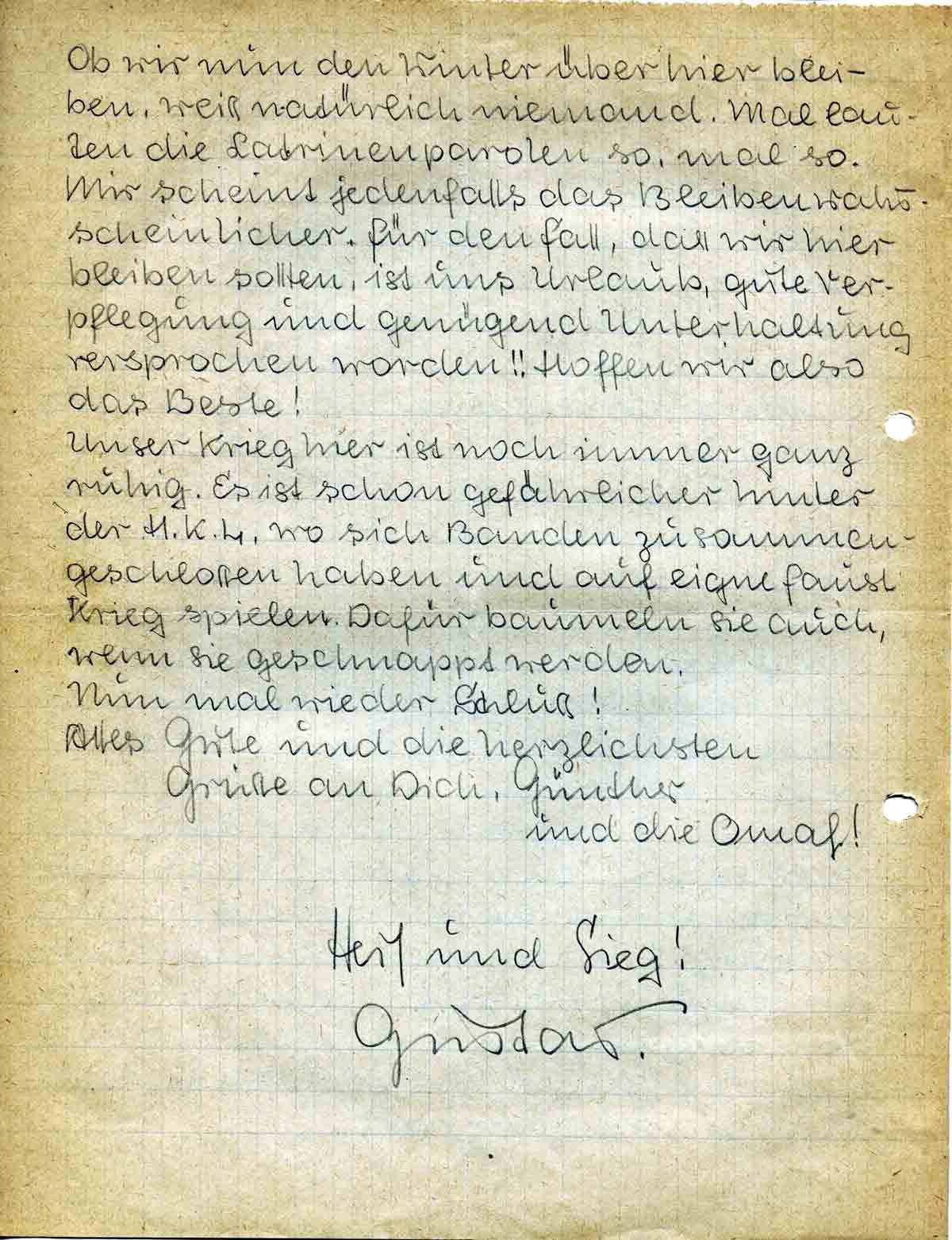 Ob wir nun den Winter über hier bleiben, weiss natürlich niemand. Mal lauten die Latrinenparolen so, mal so. Mir scheint jedenfalls das Bleiben wahrscheinlicher. Für den Fall, dass wir hier bleiben sollten, ist uns Urlaub, gute Verpflegung und genügend Unterhaltung versprochen worden!! Hoffen wir also das Beste!