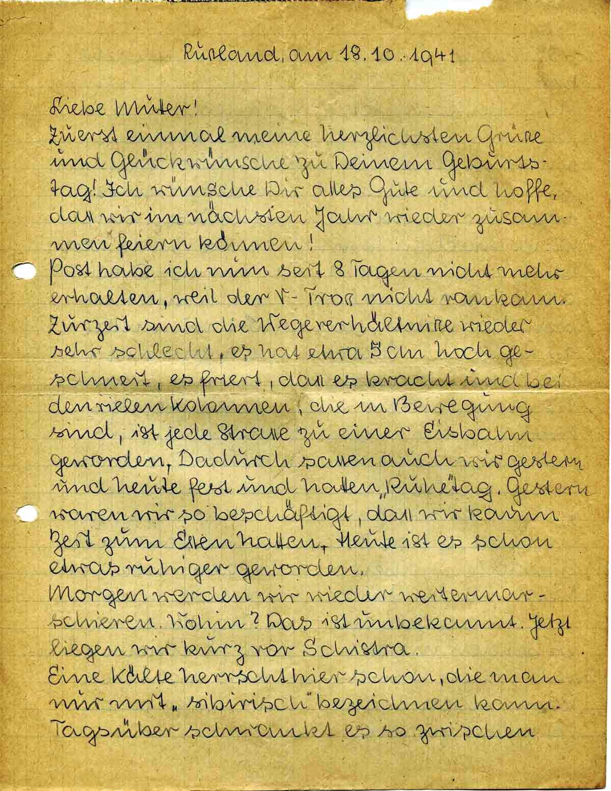 Gustav Roos an Mutter Elisabeth, 18. Oktober 1941