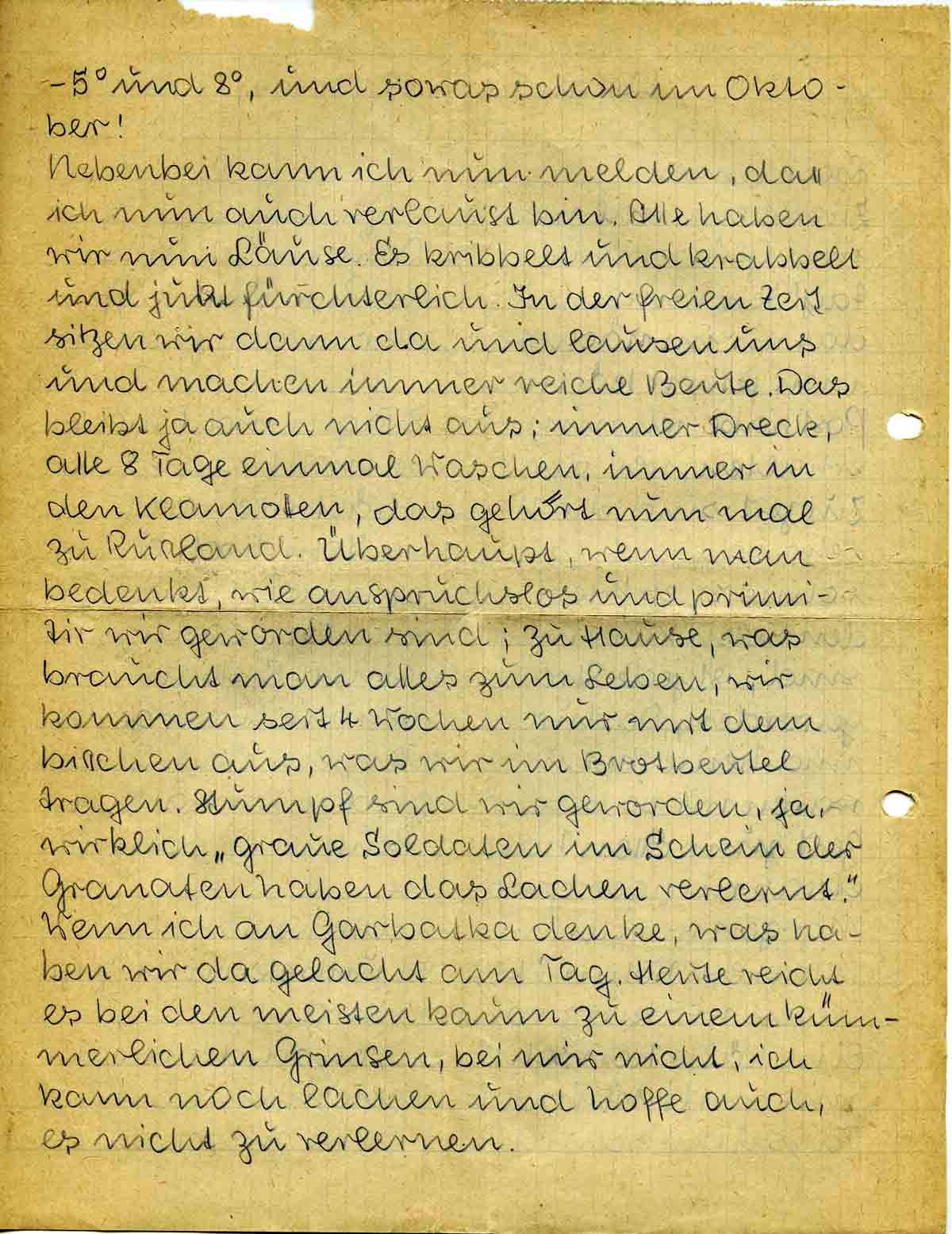 Nebenbei kann ich nun melden, dass ich nun auch verlaust bin. Alle haben wir nun Läuse. Es kribbelt und krabbelt und juckt fürchterlich. In der freien Zeit sitzen wir dann da und lausen uns und machen immer reiche Beute. Das bleibt ja auch nicht aus: immer Dreck, alle 8 Tage einmal Waschen, immer in den Klamotten, das gehört nun mal zu Russland. Überhaupt, wenn man bedenkt, wie anspruchslos und primitiv wir geworden sind; zu Hause, was braucht man alles zum Leben, wir kommen seit 4 Wochen nur mit dem bisschen aus, was wir im Brotbeutel tragen. Stumpf sind wir geworden, ja, wirklich „graue Soldaten im Schein der Granaten haben das Lachen verlernt“. Wenn ich an Garbatka denke, was haben wir da gelacht am Tag. Heute reicht es bei den meisten kaum zu einem kümmerlichen Grinsen, bei mir nicht, ich kann noch lachen und hoffe auch, es nicht zu verlernen.