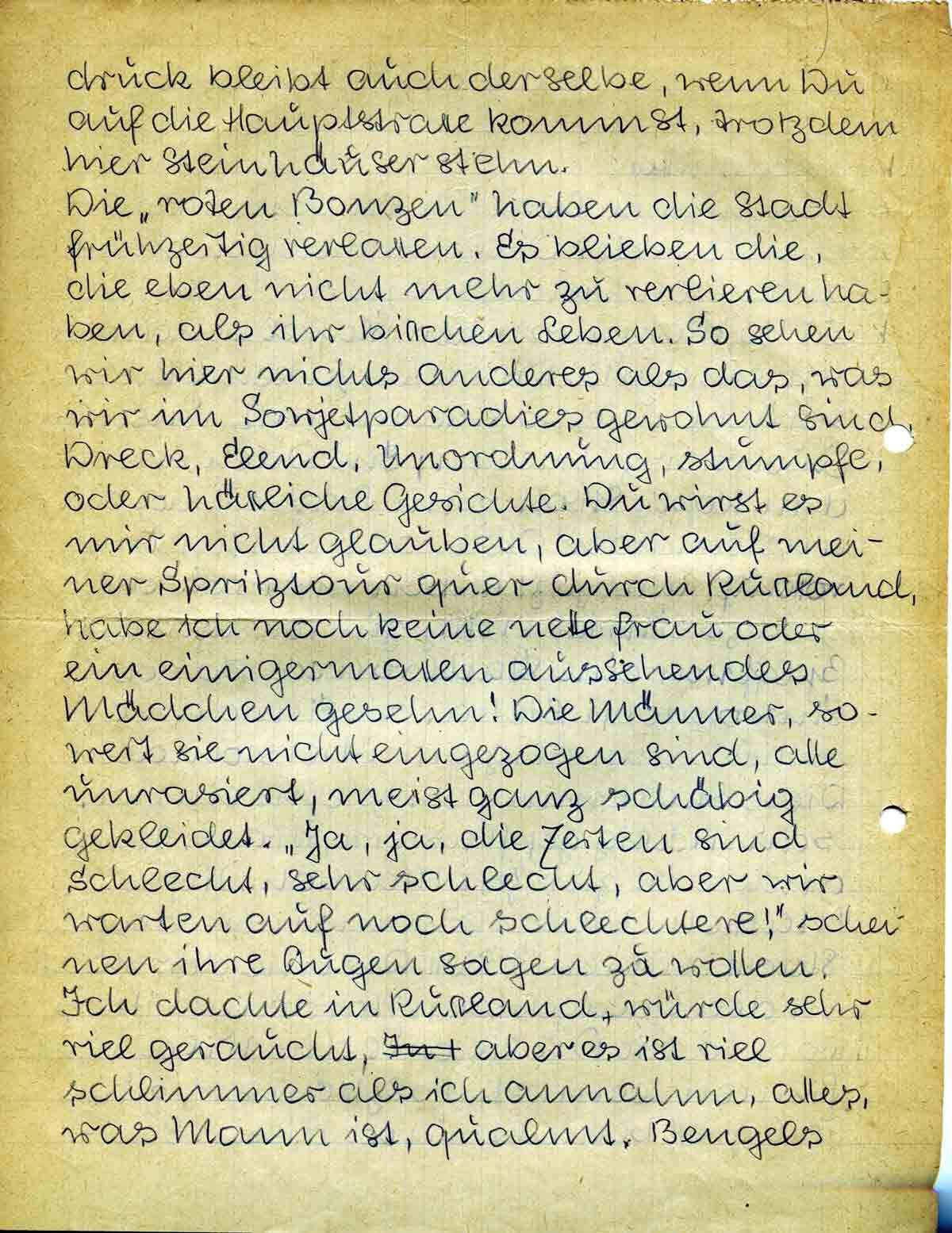 Die „roten Bonzen“ haben die Stadt frühzeitig verlassen. Es blieben die, die eben nicht mehr zu verlieren haben, als ihr bisschen Leben. So sehen wir hier nichts anderes als das, was wir im Sowjetparadies gewohnt sind. Dreck, Elend, Unordnung, stumpfe, oder hässliche Gesichte. Du wirst es mir nicht glauben, aber auf meiner Spritztour quer durch Russland, habe ich noch keine nette Frau oder ein einigermassen aussehendes Mädchen gesehn! Die Männer, soweit sie nicht eingezogen sind, alle unrasiert, meist ganz schäbig gekleidet. „Ja, ja, die Zeiten sind schlecht, sehr schlecht, aber wir warten auf noch schlechtere!“ scheinen ihre Augen sagen zu wollen. Ich dachte in Russland würde sehr viel geraucht, aber es ist viel schlimmer als ich annahm, alles, was Mann ist, qualmt. Bengels