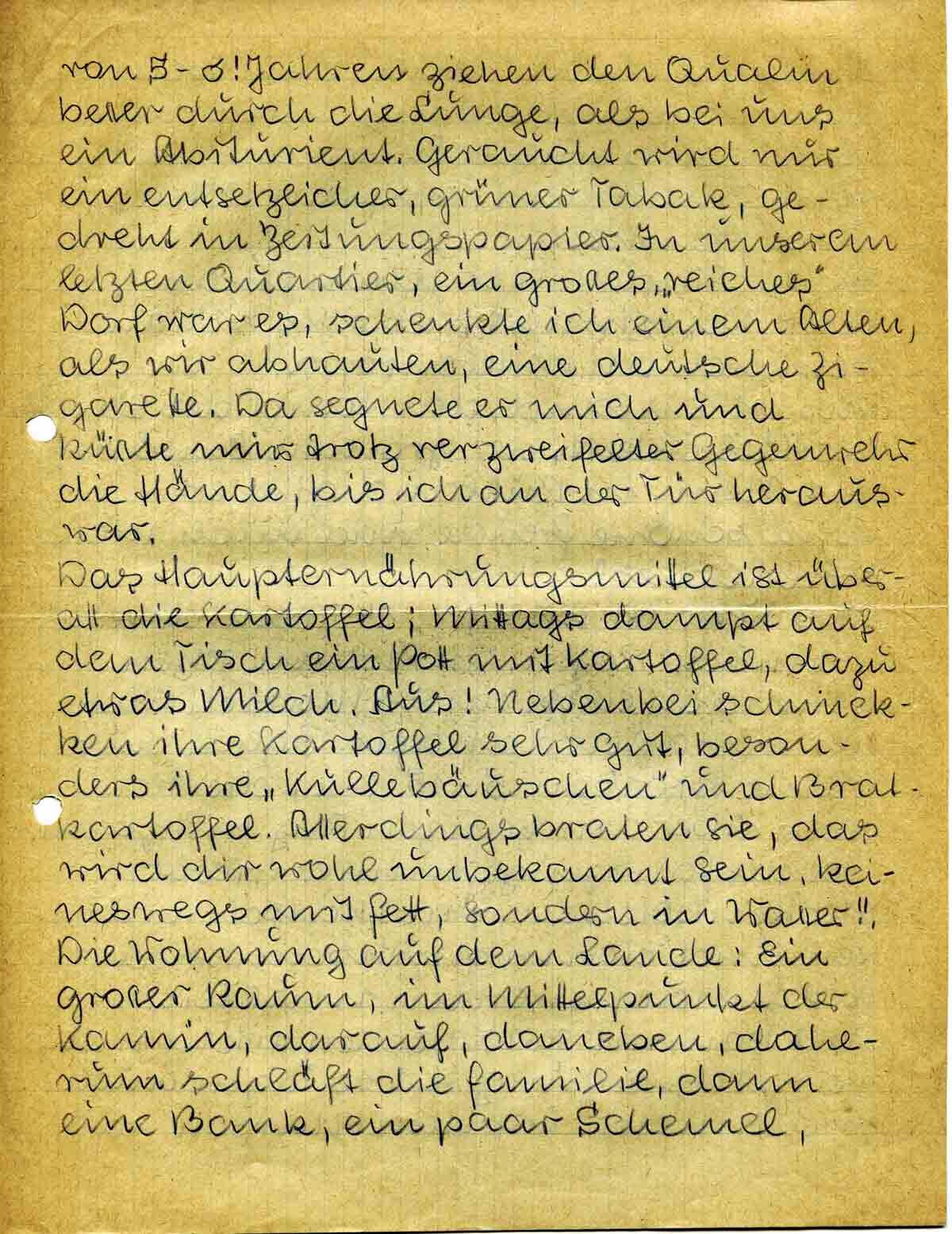 Das Haupternährungsmittel ist überall die Kartoffel; Mittags dampft auf dem Tisch ein Pott mit Kartoffel, dazu etwas Milch. Aus! Nebenbei schmecken ihre Kartoffel sehr gut, besonders ihre „Kullebäuschen“ und Bratkartoffel. Allerdings braten sie, das wird dir wohl unbekannt sein, keineswegs mit Fett, sondern in Wasser!! Die Wohnung auf dem Lande: Ein grosser Raum, im Mittelpunkt der Kamin, darauf, daneben, daherum schläft die Familie, dann eine Bank, ein paar Schemel,