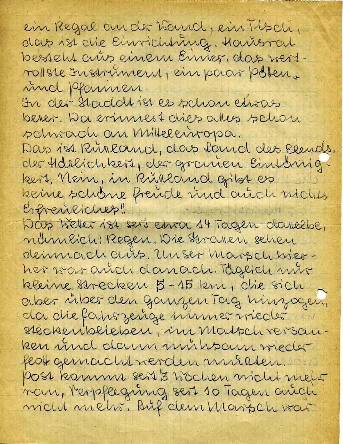 Das Wetter ist seit etwa 14 Tagen dasselbe, nämlich: Regen. Die Strassen sehen demnach aus. Unser Marsch hierher war auch danach. Täglich nur kleine Strecken 5-15 km, die sich aber über den ganzen Tag hinzogen, da die Fahrzeuge immer wieder steckenblieben, im Matsch versanken und dann mühsam wieder flott gemacht werden mussten. Post kommt seit 3 Wochen nicht mehr ran, Verpflegung seit 10 Tagen auch nicht mehr. Auf dem Marsch war