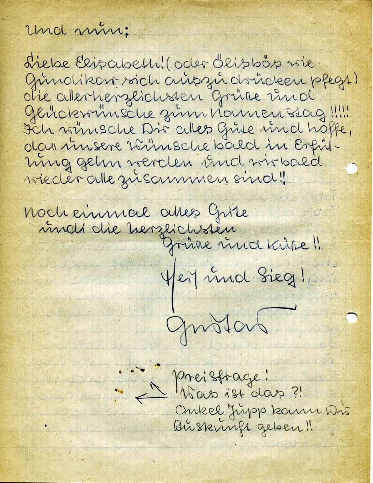 Liebe Elisabeth! (oder Ölisbös wie Gundikar sich auszudrücken pflegt) die allerherzlichsten Grüsse und Glückwünsche zum Namenstag!!!!! Ich wünsche Dir alles Gute und hoffe, dass unsere Wünsche bald in Erfüllung gehn werden und wir bald wieder alle zusammen sind!!