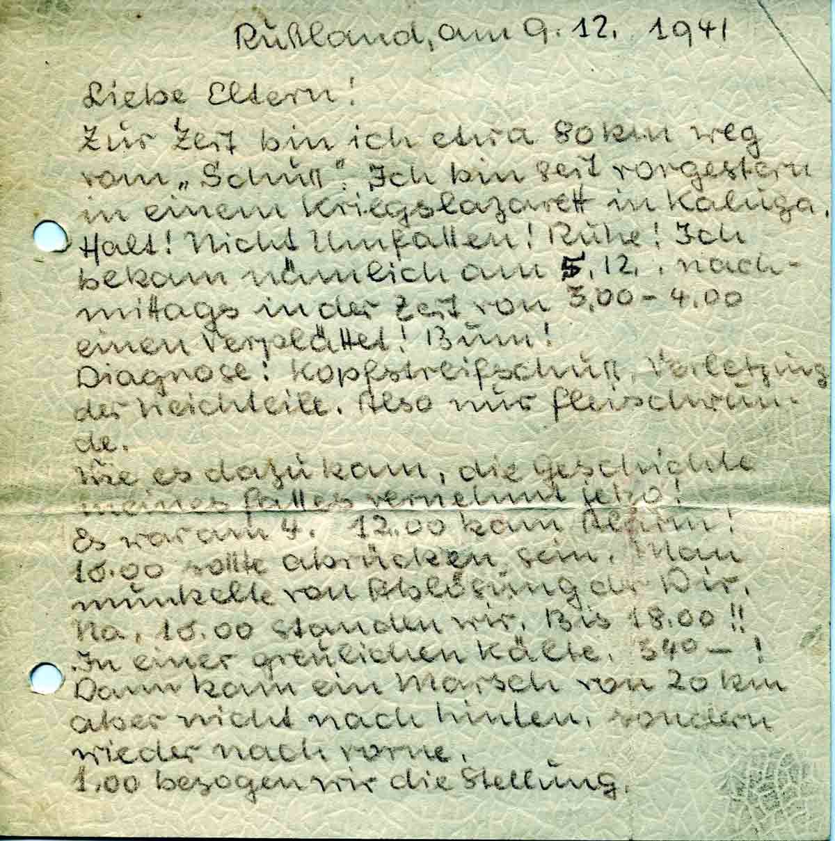 Zur Zeit bin ich etwa 80 km weg vom „Schuss“. Ich bin seit vorgestern in einem Kriegslazarett in Kaluga. Halt! Nicht Umfallen! Ruhe! Ich bekam nämlich am 5.12. nachmittags in der Zeit von 3.00-4.00 einen verplättet! Bum!