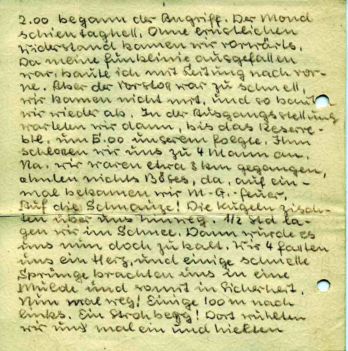 2.00 begann der Angriff. Der Mond schien taghell. Ohne ernstlichen Widerstand kamen wir vorwärts. Da meine Funklinie ausgefallen war, baute ich mit Leitung nach vorne. Aber der Vorstoss war zu schnell, wir kamen nicht mit, und so bauten wir wieder ab. In der Ausgangsstellung warteten wir dann, bis das Reservebtl. um 5.00 unserem folgte. Ihm schlossen wir uns zu 4 Mann an. Na, wir waren etwa 3 km gegangen, ahnten nichts Böses, da, auf einmal bekamen wir M-G.-Feuer. Auf die Schnauze! Die Kugeln zischten über uns hinweg. ½ Std. lagen wir im Schnee. Dann wurde es uns nun doch zu kalt. Wir 4 fassten uns ein Herz, und einige schnelle Sprünge brachten uns in eine Mulde und somit in Sicherheit. Nun mal weg! Einige 100 m nach links. Ein Strohberg! Dort wühlten wir uns mal ein und hielten