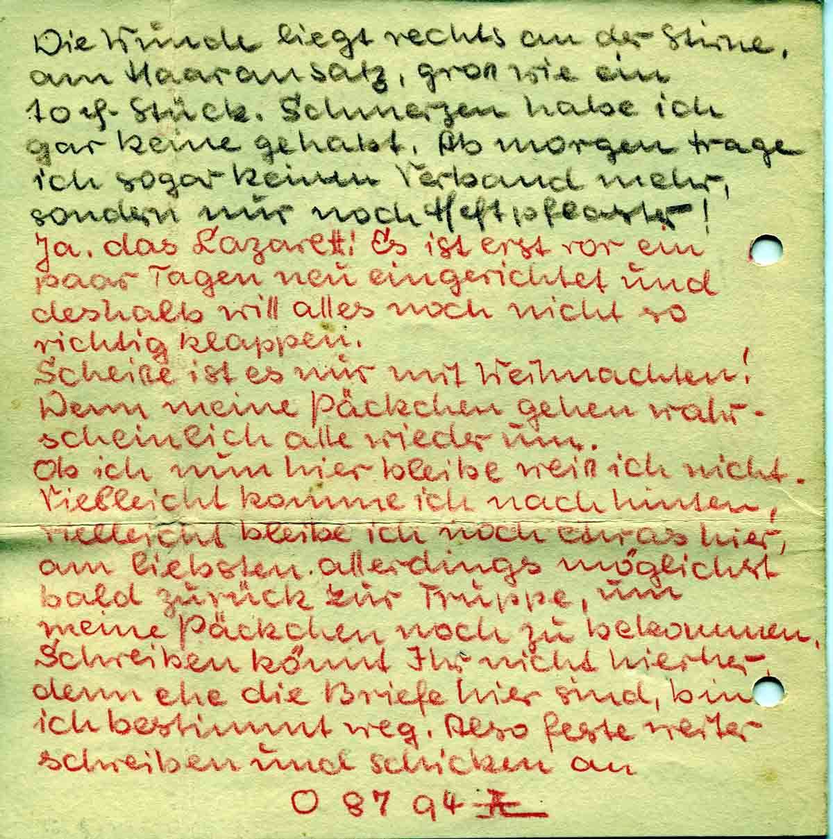 Ob ich nun hier bleibe weiß ich nicht. Vielleicht komme ich nach hinten, vielleicht bleibe ich noch etwas hier, am liebsten allerdings möglichst bald zurück zur Truppe, um meine Päckchen noch zu bekommen. Schreiben könnt Ihr nicht hierher, denn ehe die Briefe hier sind, bin ich bestimmt weg. Also feste weiter schreiben und schicken an