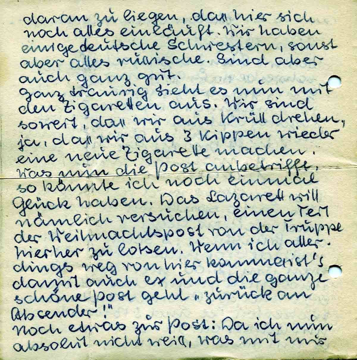 Ganz traurig sieht es nun mit den Zigaretten aus. Wir sind soweit, dass wir aus Krüll drehen, ja, dass wir aus 3 Kippen wieder eine neue Zigarette machen. Was nun die Post anbetrifft, so könnte ich noch einmal Glück haben. Das Lazarett will nämlich versuchen, einen Teil der Weihnachtspost von der Truppe hierher zu lotsen. Wenn ich allerdings weg von hier komme, ist’s damit auch ex und die ganze schöne Post geht „zurück an Absender!“