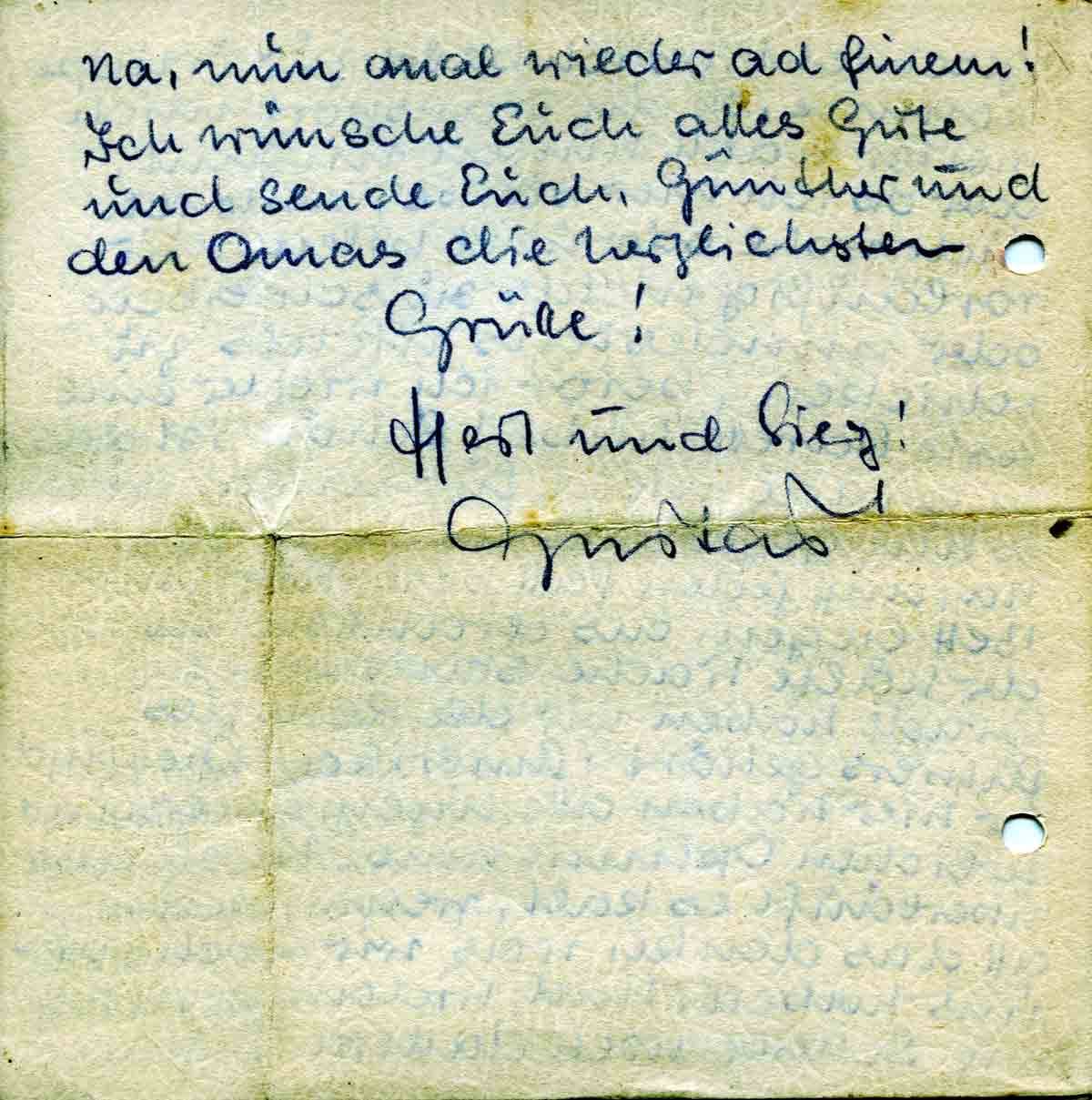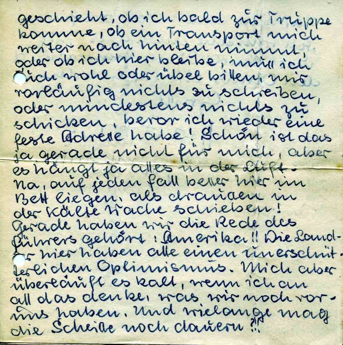 geschieht, ob ich bald zur Truppe komme, ob ein Transport mich weiter nach hinten nimmt, oder ob ich hier bleibe, muss ich Euch wohl oder übel bitten, mir vorläufig nichts zu schreiben, oder mindestens nichts zu schicken, bevor ich wieder eine feste Adresse habe! Schön ist das ja gerade nicht für mich, aber es hängt ja alles in der Luft. Na, auf jeden Fall besser hier im Bett liegen, als draußen in der Kälte Wache schieben! Gerade haben wir die Rede des Führers gehört: Amerika!! Die Landser hier haben alle einen unerschütterlichen Optimismus. Mich aber überläuft es kalt, wenn ich an all das denke, was wir noch vor uns haben. Und wielange mag die Scheiße noch dauern?!!
