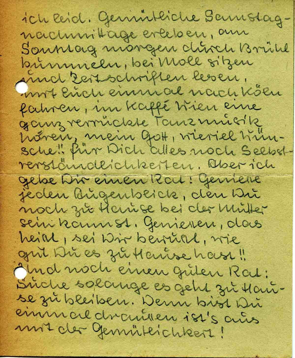 ich leid. Gemütliche Samstagnachmittage erleben, am Sonntag morgen durch Brühl bummeln, bei Moll sitzen und Zeitschriften lesen, mit Euch einmal nach Köln fahren, im Kaffé Wien eine ganz verrückte Tanzmusik hören, mein Gott, wieviel Wünsche!! Für Dich alles noch Selbstverständlichkeiten. Aber ich gebe Dir einen Rat: Geniesse jeden Augenblick, den Du noch zu Hause bei der Mutter sein kannst. Geniessen, das heisst, sei Dir bewusst, wie gut Du es zu Hause hast!! Und noch einen guten Rat: Suche solange es geht zu Hause zu bleiben. Denn bist Du einmal draussen ist’s aus mit der Gemütlichkeit!