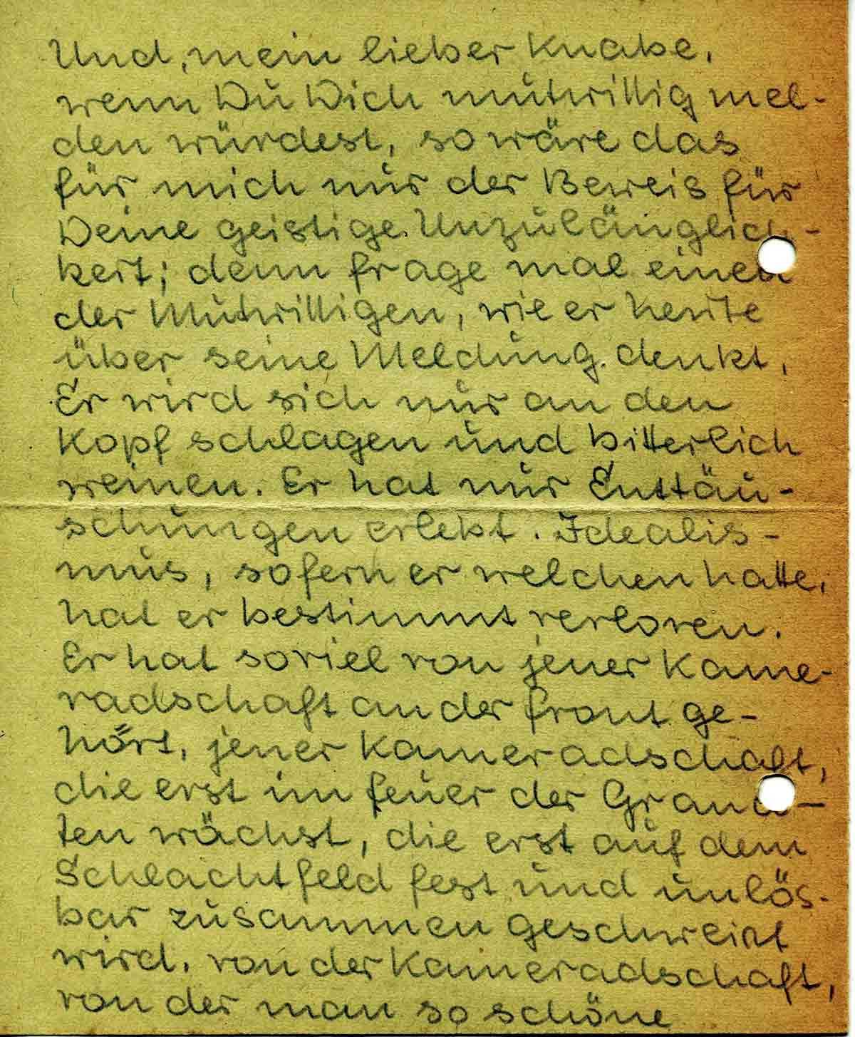 Und, mein lieber Knabe, wenn Du Dich mutwillig melden würdest, so wäre das für mich nur der Beweis für Deine geistige Unzulänglichkeit; denn frage mal einen der Mutwilligen, wie er heute über seine Meldung denkt. Er wird sich nur an den Kopf schlagen und bitterlich weinen. Er hat nur Enttäuschungen erlebt. Idealismus, sofern er welchen hatte, hat er bestimmt verloren. Er hat soviel von jener Kameradschaft an der Front gehört, jener Kameradschaft, die erst im Feuer der Granaten wächst, die erst auf dem Schlachtfeld fest und unlösbar zusammen geschweißt wird, von der Kameradschaft, von der man so schöne