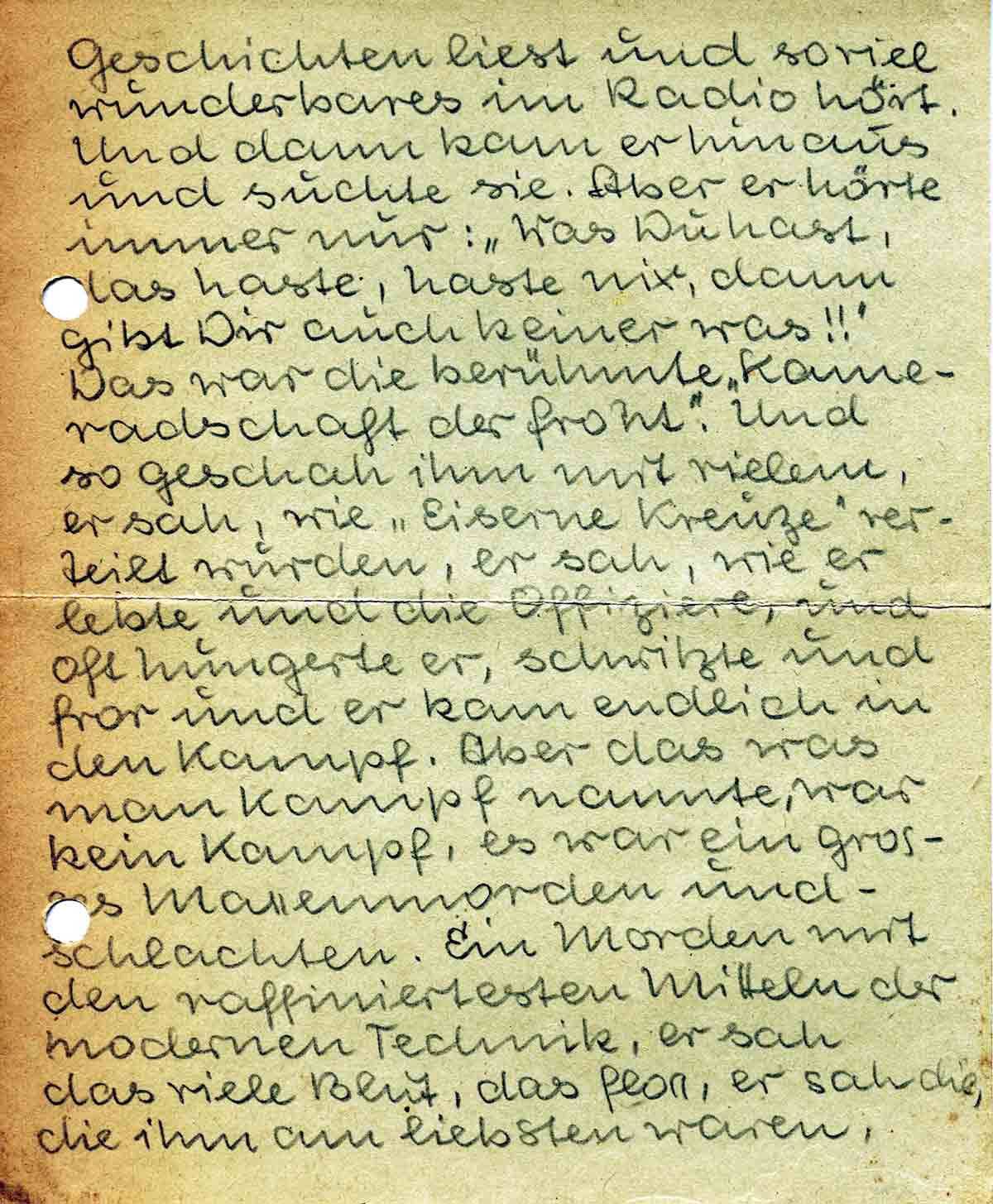Geschichten liest und soviel wunderbares im Radio hört. Und dann kam er hinaus und suchte sie. Aber er hörte immer nur: „Was Du hast, das haste, haste nix, dann gibt Dir auch keiner was!!“ Das war die berühmte „Kameradschaft der Front“. Und so geschah ihm mit vielem, er sah, wie „Eiserne Kreuze“ verteilt wurden, er sah, wie er lebte und die Offiziere, und oft hungerte er, schwitzte und fror und er kam endlich in den Kampf. Aber das was man Kampf nannte, war kein Kampf, es war ein grosses Massenmorden und –schlachten. Ein Morden mit den raffiniertesten Mitteln der modernen Technik, er sah das viele Blut, das floss, er sah die, die ihm am liebsten waren,