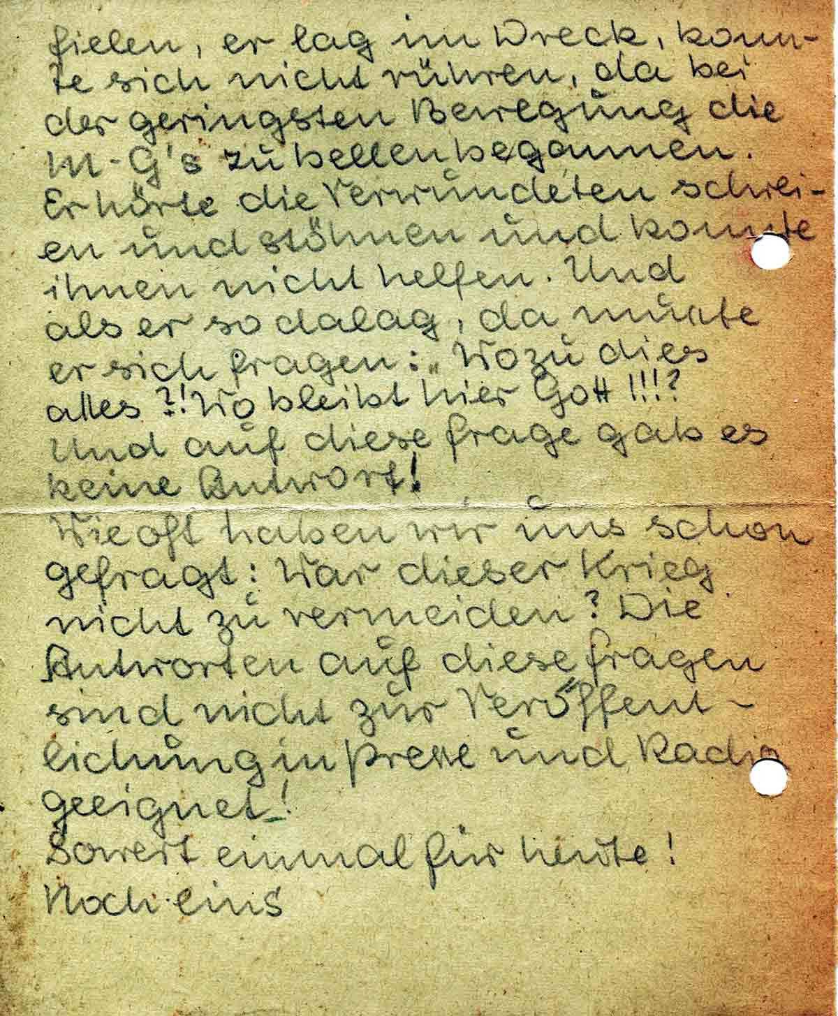 fielen, er lag im Dreck, konnte sich nicht rühren, da bei der geringsten Bewegung die M-G’s zu bellen begannen. Er hörte die Verwundeten schreien und stöhnen und konnte ihnen nicht helfen. Und als er so dalag, da musste er sich fragen: „Wozu dies alles?! Wo bleibt hier Gott!!!? Und auf diese Frage gab es keine Antwort!