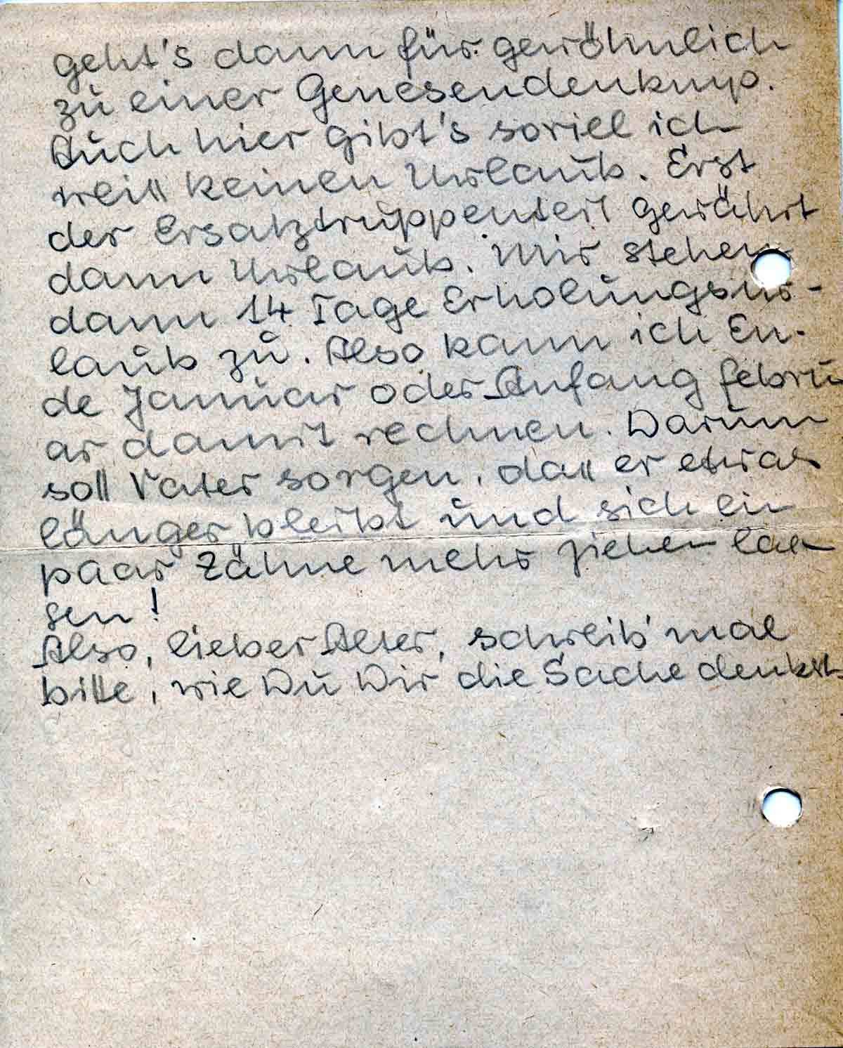 rett geht’s dann für gewöhnlich zu einer Genesungskmp. Auch hier gibt’s soviel ich weiss keinen Urlaub. Erst der Ersatztruppenteil gewährt dann Urlaub. Mir stehen dann 14 Tage Erholungsurlaub zu. Also kann ich Ende Januar oder Anfang Februar damit rechnen. Darum soll Vater sorgen, dass er etwas länger bleibt und sich ein paar Zähne mehr ziehen lassen!