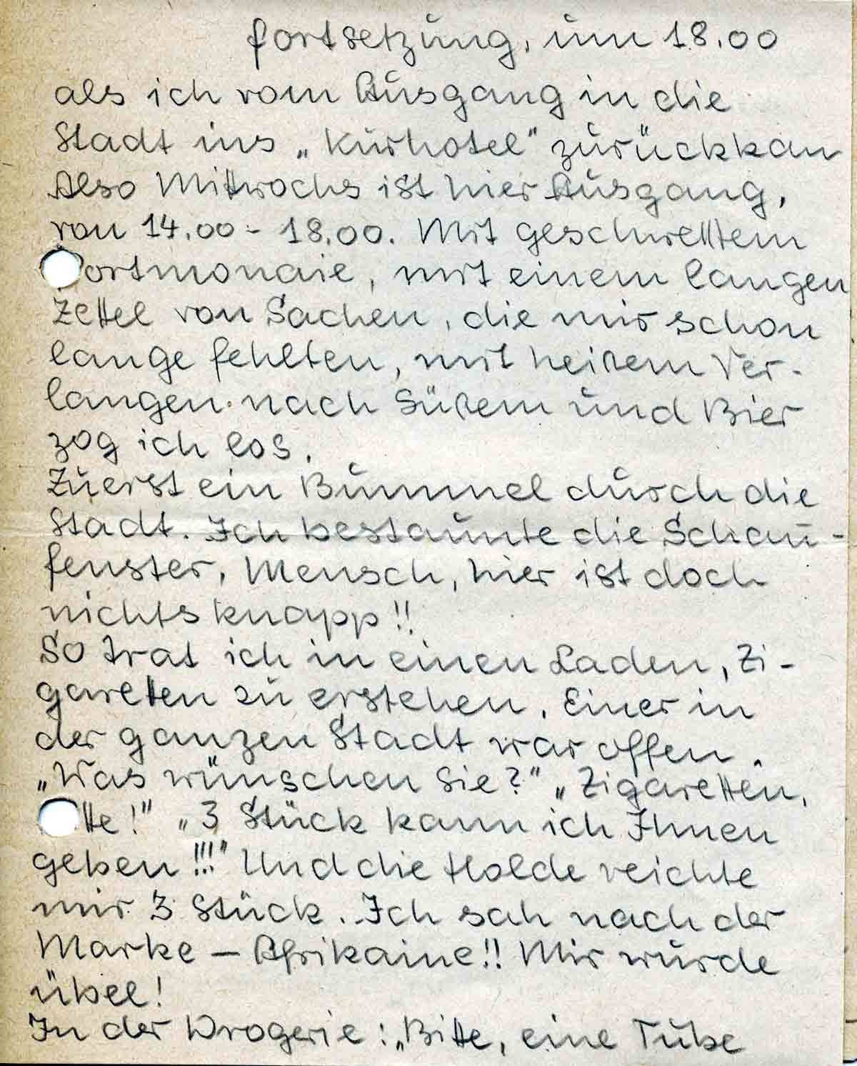 als ich vom Ausgang in die Stadt ins „Kurhotel“ zurückkam. Also Mittwochs ist hier Ausgang, von 14.00-18.00. Mit geschwelltem Portmonaie, mit einem langen Zettel von Sachen, die mir schon lange fehlten, mit heissem Verlangen nach Süssen und Bier zog ich los.