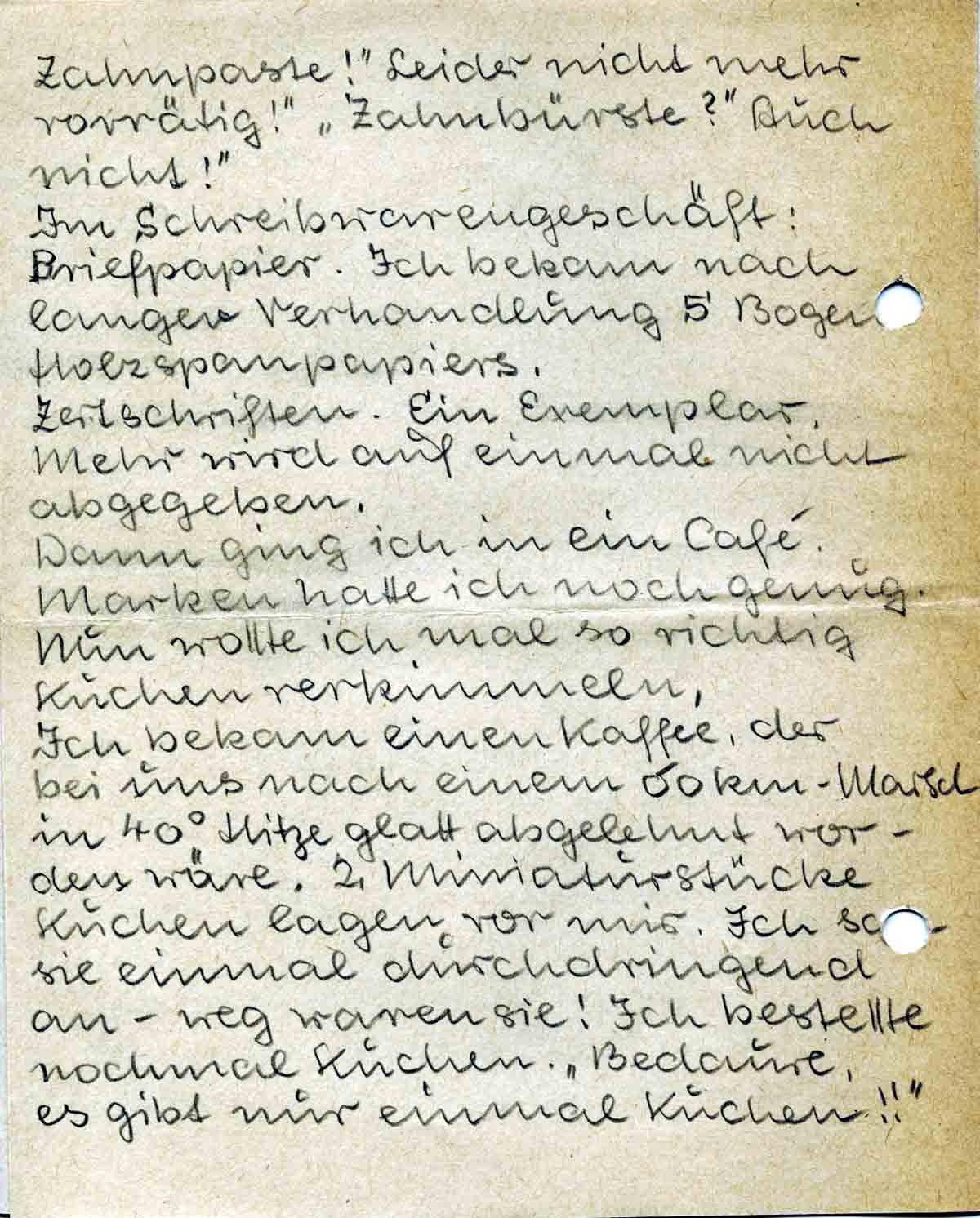 Im Schreibwarengeschäft: Briefpapier. Ich bekam nach langer Verhandlung 5 Bogen Holzspanpapiers.