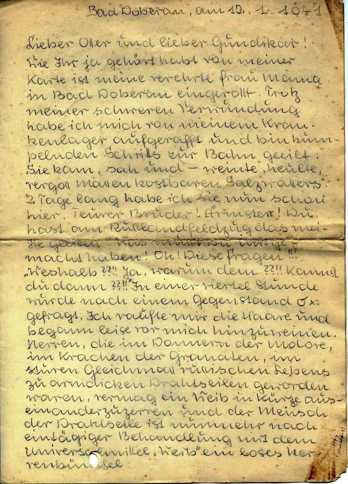 Wie Ihr ja gehört habt von meiner Karte ist meine verehrte Frau Mama in Bad Doberan eingerollt. Trotz meiner schweren Verwundung habe ich mich von meinem Krankenlager aufgerafft und bin humpelnden Schritts zur Bahn geeilt. Sie kam, sah und – weinte, heulte, vergoss Massen kostbaren Salzwassers. 2 Tage lang habe ich sie nun schon hier. Teurer Bruder! Ärmster! Du hast am Russlandfeldzug das meiste gelitten!! Was musst Du mitgemacht haben! Oh! Diese Fragen!!! „Weshalb??!! Ja, warum denn??!! Kannst du dann??!!“ In einer viertel Stunde wurde nach einem Gegenstand 6 x gefragt. Ich raufte mir die Haare und begann leise vor mich hinzuweinen. Nerven, die im Donnern der Motore, im Krachen der Granaten, im sturen Gleichmass russischen Lebens zu armdicken Drahtseilen geworden waren, vermag ein Weib in Kürze auseinanderzuzerren und der Mensch der Drahtseile ist nunmehr nach eintägiger Behandlung mit dem Universalmittel „Weib“ ein loses Nervenbündel.